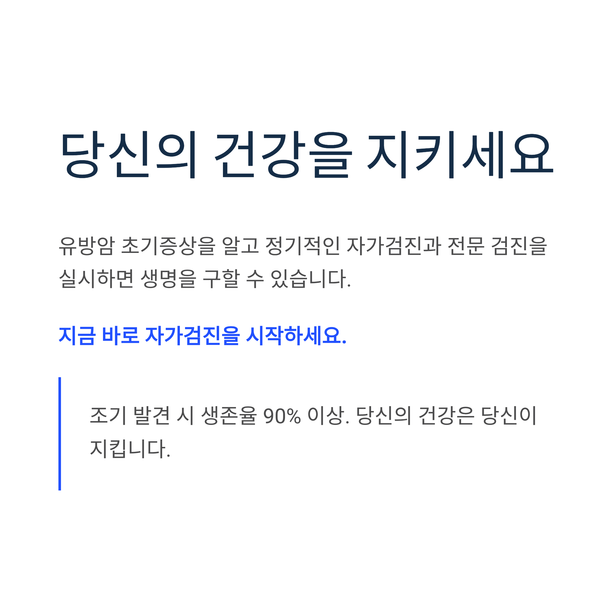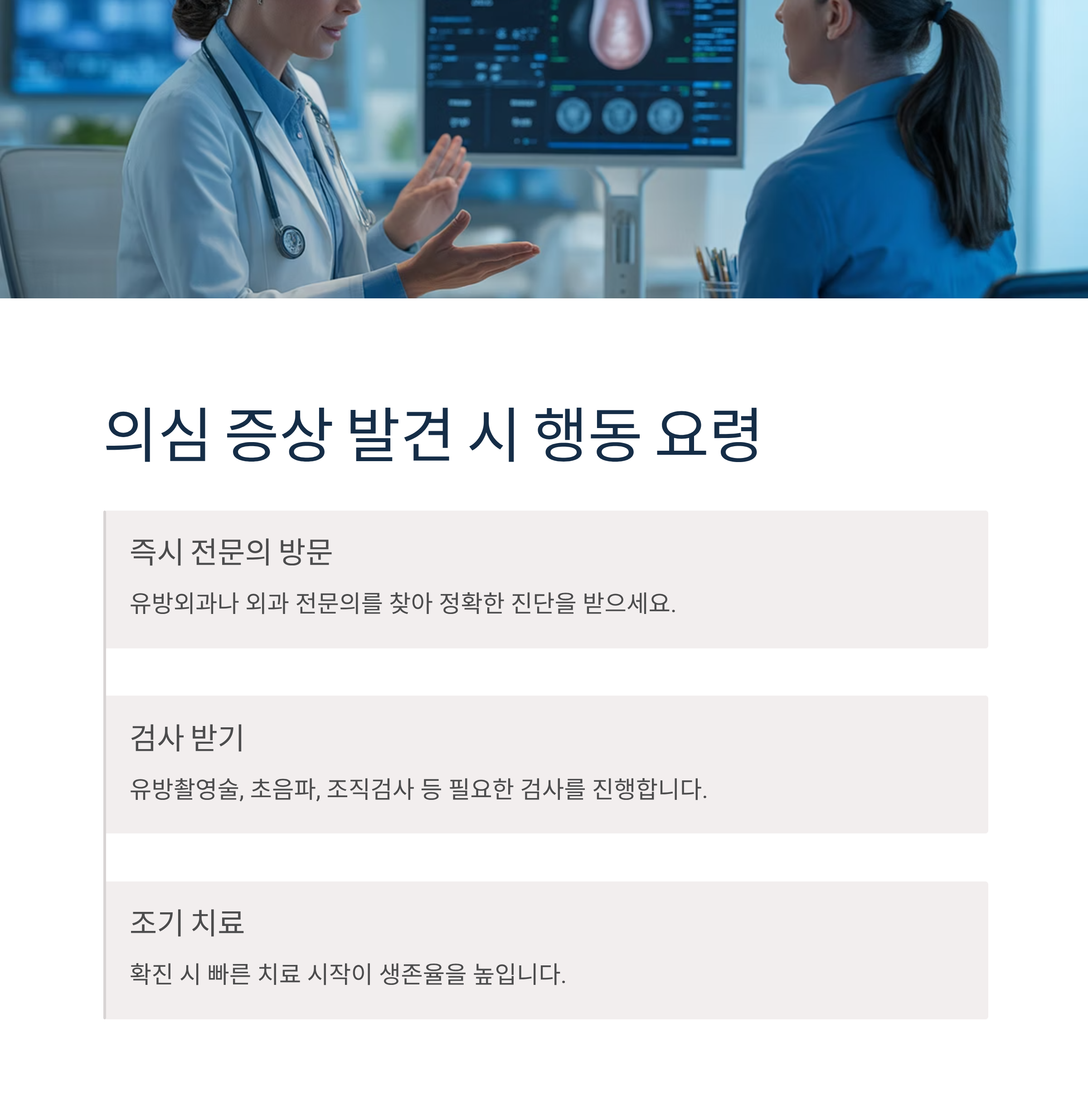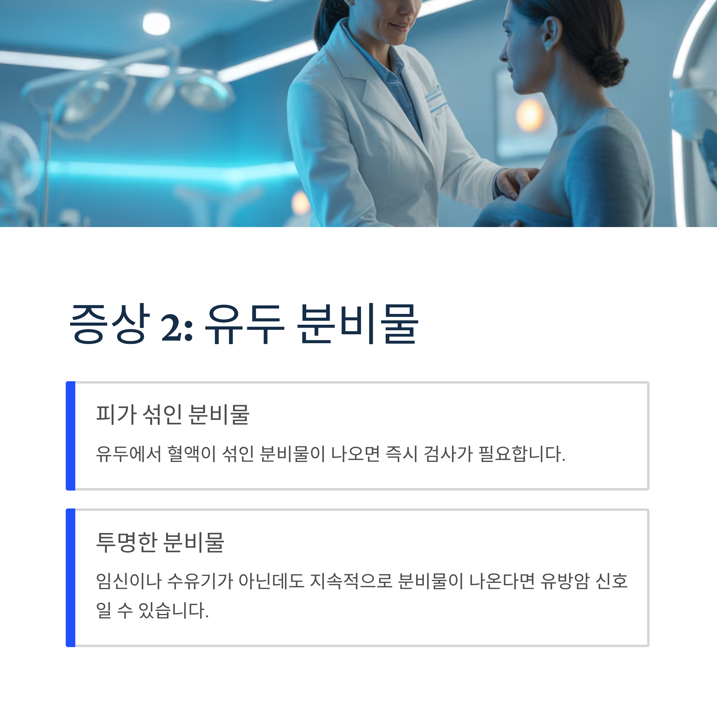 본 글은 의학적 조언을 대체할 수 없으며, 유방암 의심 증상이 있다면 반드시 의료기관을 방문하여 전문의 진료를 받으시기 바랍니다.