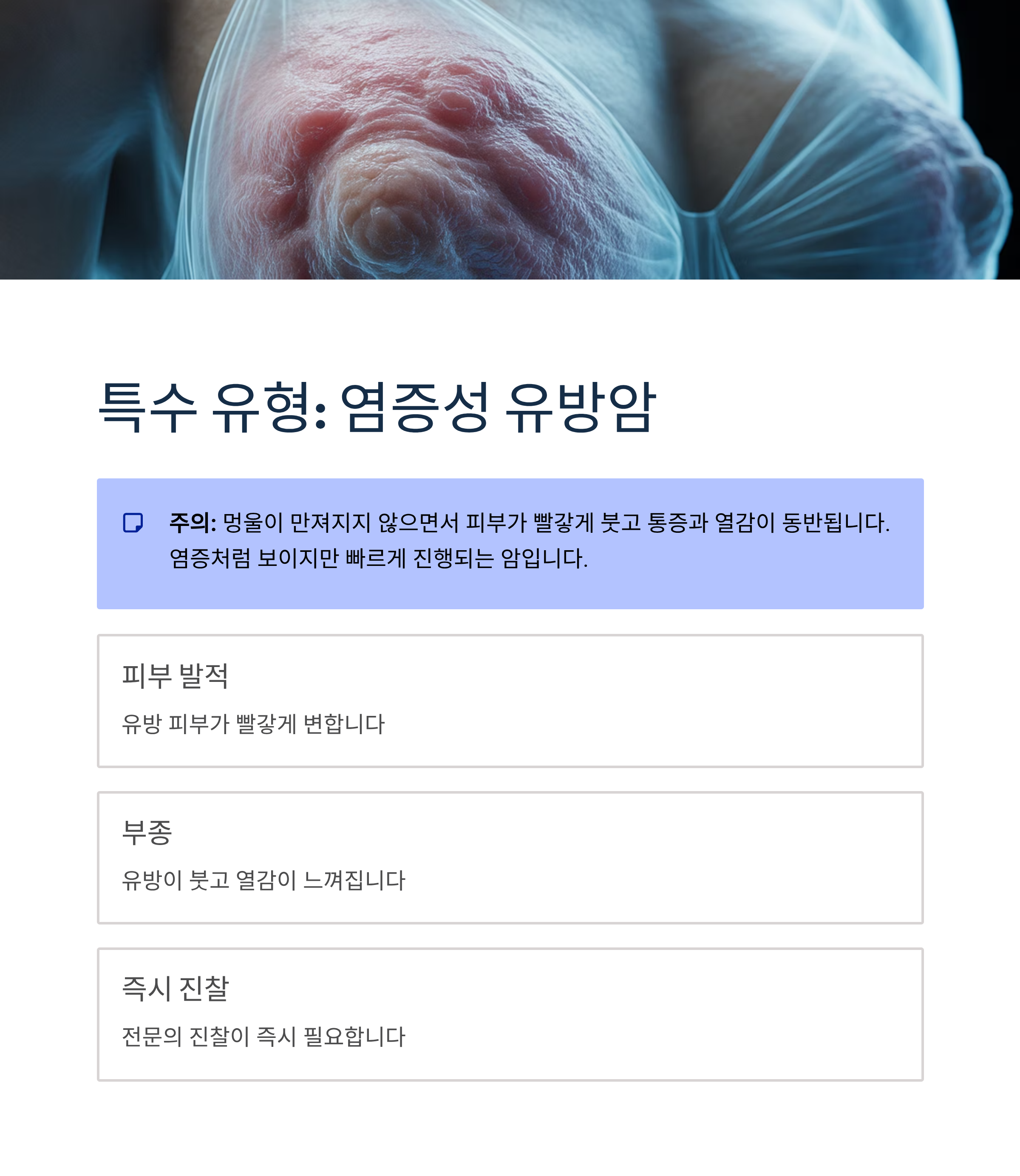 특수한 형태인 염증성 유방암은 멍울이 만져지지 않으면서 피부가 빨갛게 붓고 통증과 열감이 동반됩니다. 염증처럼 보이지만 빠르게 진행되는 암으로, 즉시 전문의 진찰이 필요합니다.