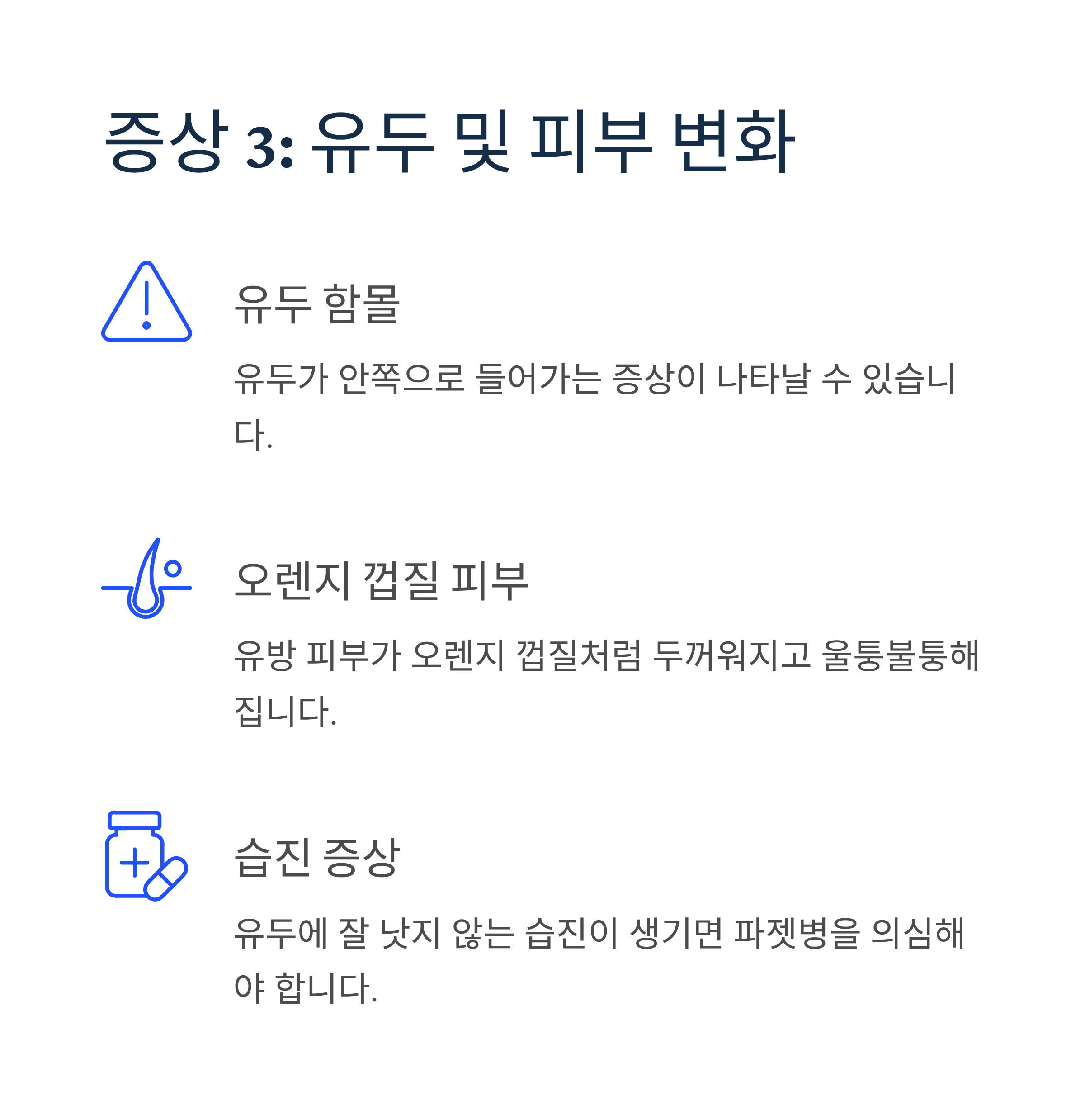 유두가 함몰되거나 유방 피부가 오렌지 껍질처럼 두꺼워지는 증상이 나타날 수 있습니다. 유두에 잘 낫지 않는 습진이 생기는 경우 파젯병(유방암의 일종)을 의심해볼 수 있습니다.