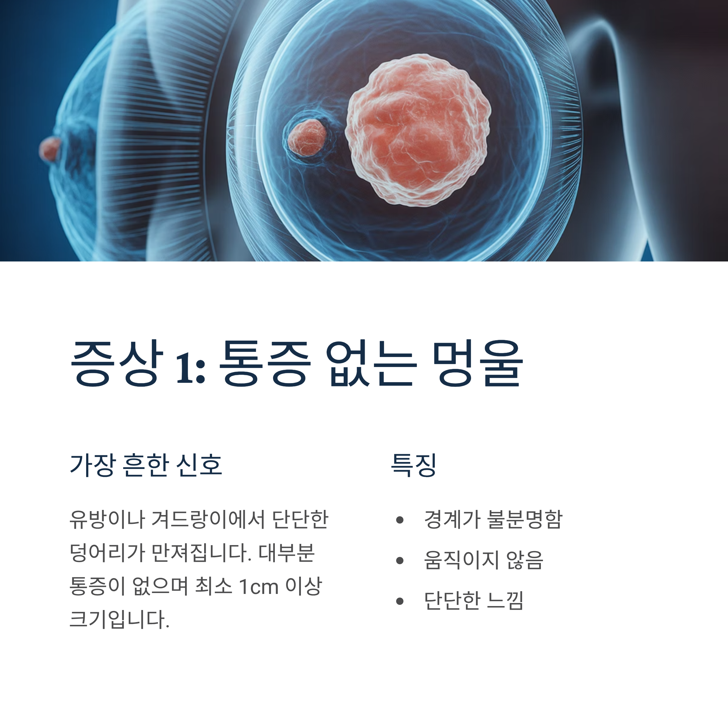 가장 흔하게 나타나는 증상으로, 유방이나 겨드랑이에서 단단한 덩어리가 만져집니다. 유방암으로 인한 멍울은 대부분 통증이 없으며, 만져질 정도라면 최소 1cm 이상 크기입니다. 양성 종양과 달리 경계가 불분명하고 움직이지 않는 특징이 있습니다.
