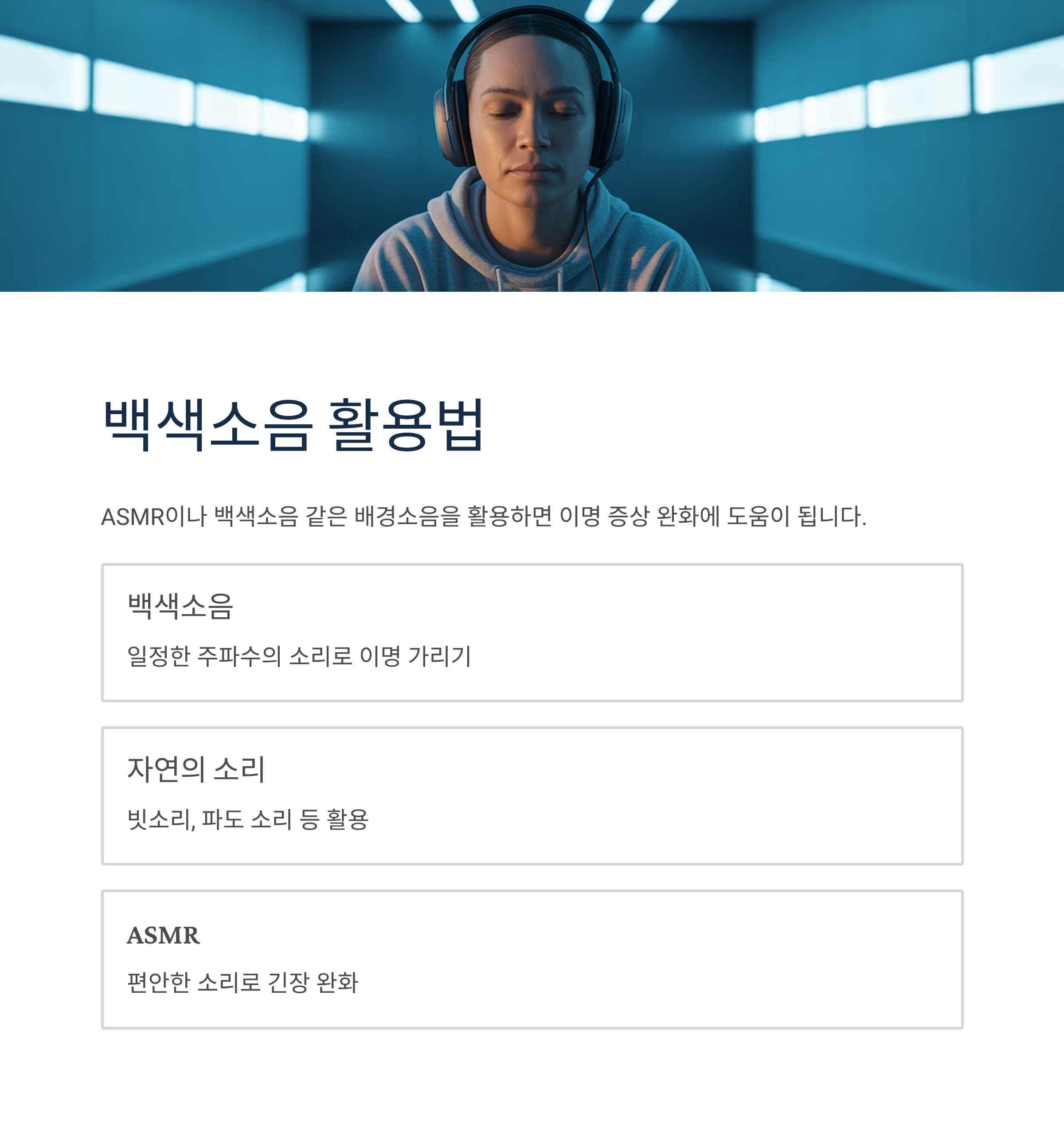 충분한 수면과 규칙적인 식생활을 유지하고, 과도한 음주와 카페인 섭취를 자제해야 합니다. 헤드폰 장시간 사용을 피하고, 시끄러운 환경에 대한 노출을 줄입니다. 스트레스 관리를 위해 명상이나 요가 등 이완 활동을 실천하며, 백색소음이나 ASMR 같은 배경소음을 활용하는 것도 도움이 됩니다.
