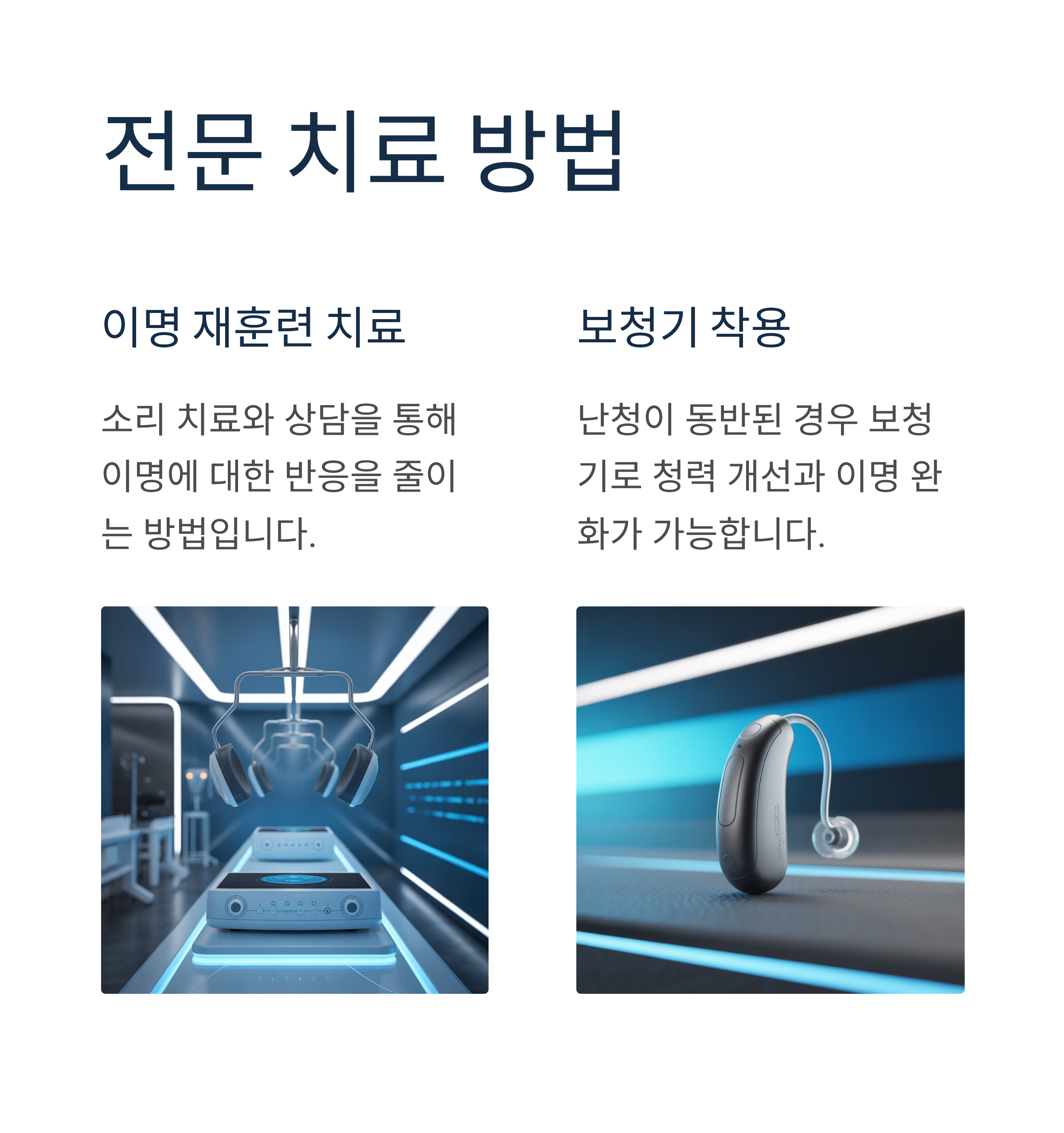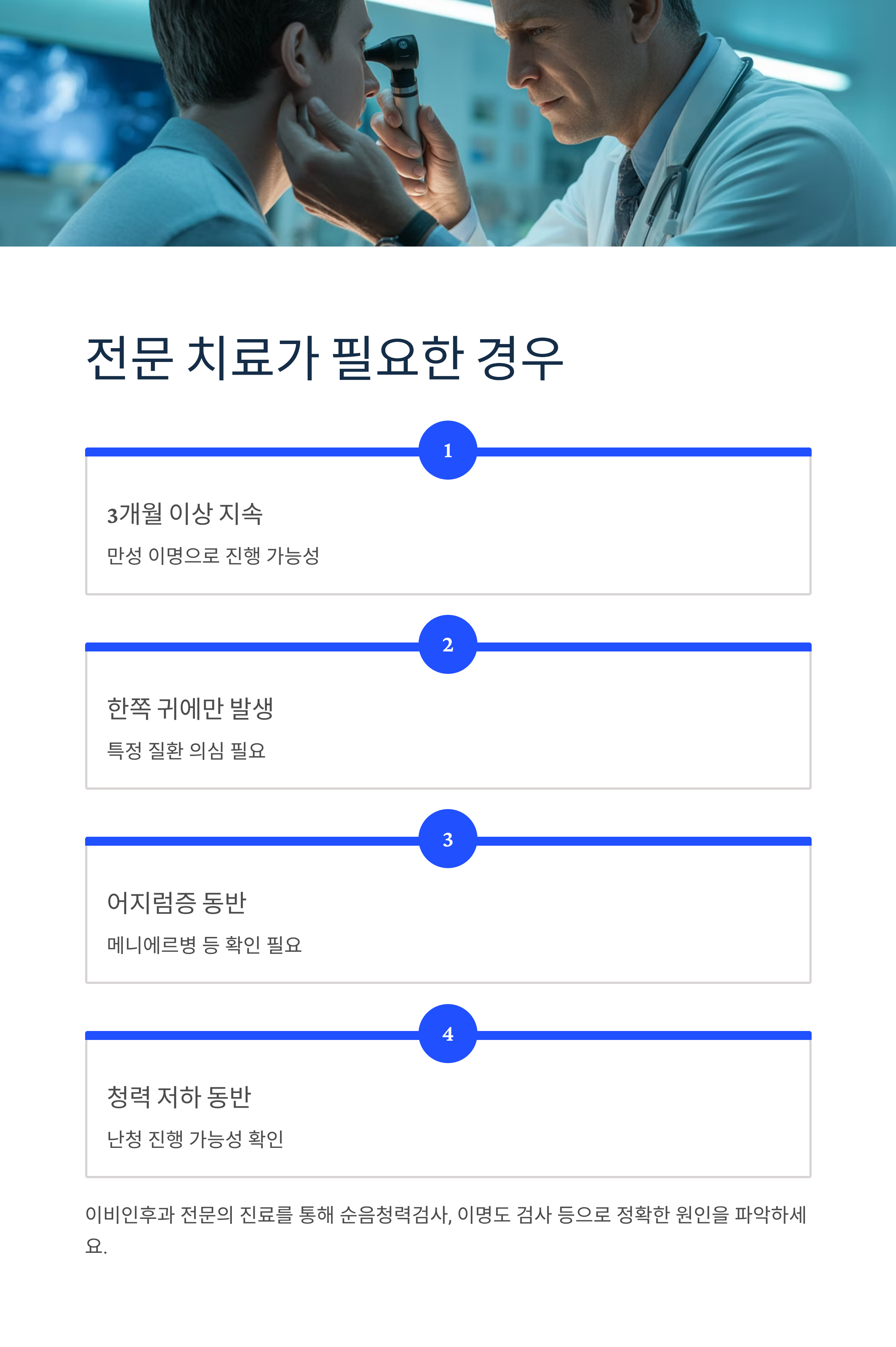 이명이 3개월 이상 지속되거나, 한쪽 귀에만 나타나거나, 어지럼증과 청력 저하가 동반되면 반드시 이비인후과 전문의의 진료를 받아야 합니다. 순음청력검사, 이명도 검사 등을 통해 정확한 원인을 파악하고, 이명 재훈련 치료나 보청기 등의 적절한 치료를 받을 수 있습니다.