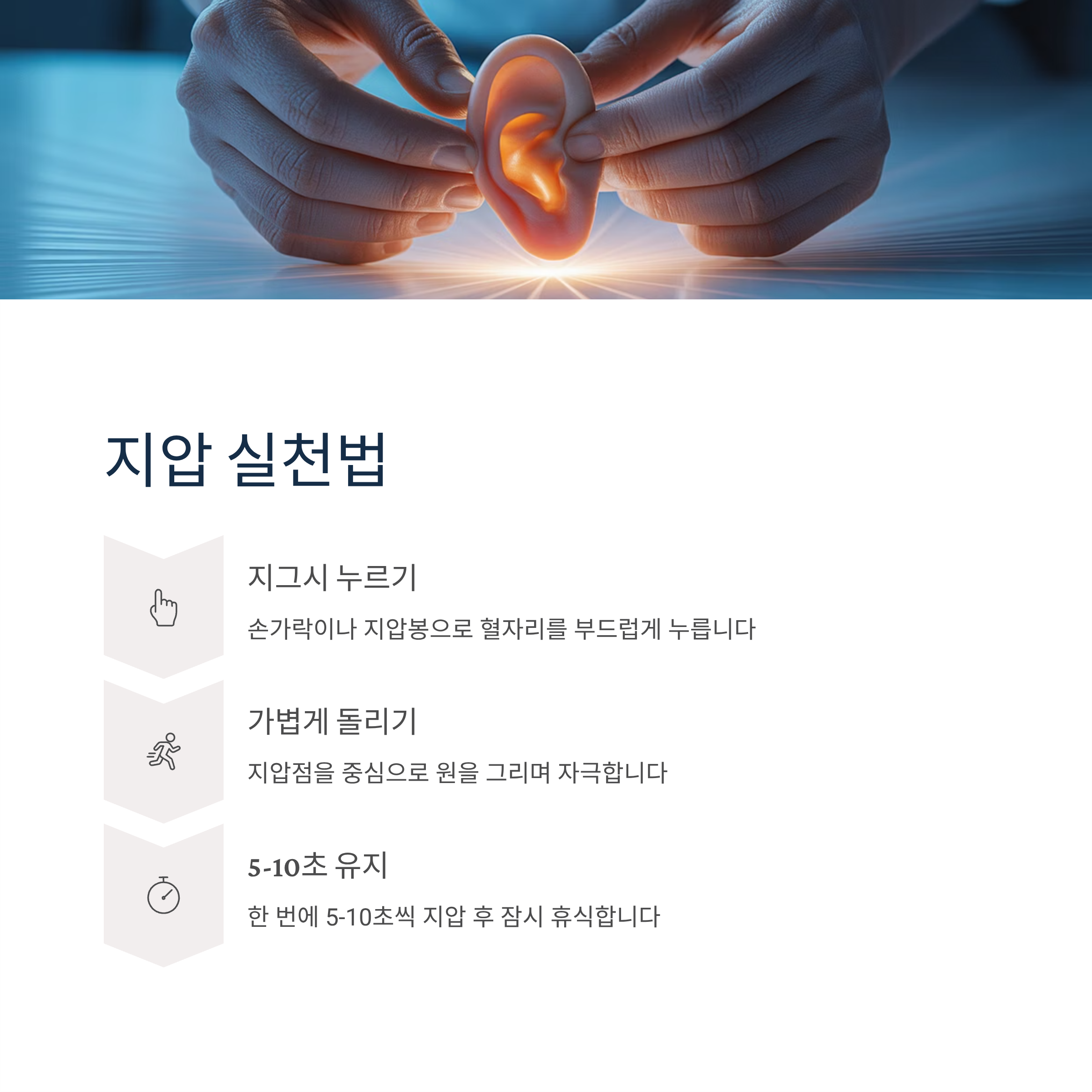 손가락이나 지압봉으로 혈자리를 지그시 눌러 가볍게 지압점을 돌립니다. 심하지 않은 이명은 증상이 나타날 때 한 번에 5-10초씩 지압하고 잠시 쉰 후 다시 지압하는 방식으로 총 3분 정도 실시합니다. 만성 이명은 하루 3-4회 반복하면 효과적입니다. 지압을 너무 세게 하면 피부가 손상될 수 있으니 끈기 있게 천천히 진행하는 것이 중요합니다.