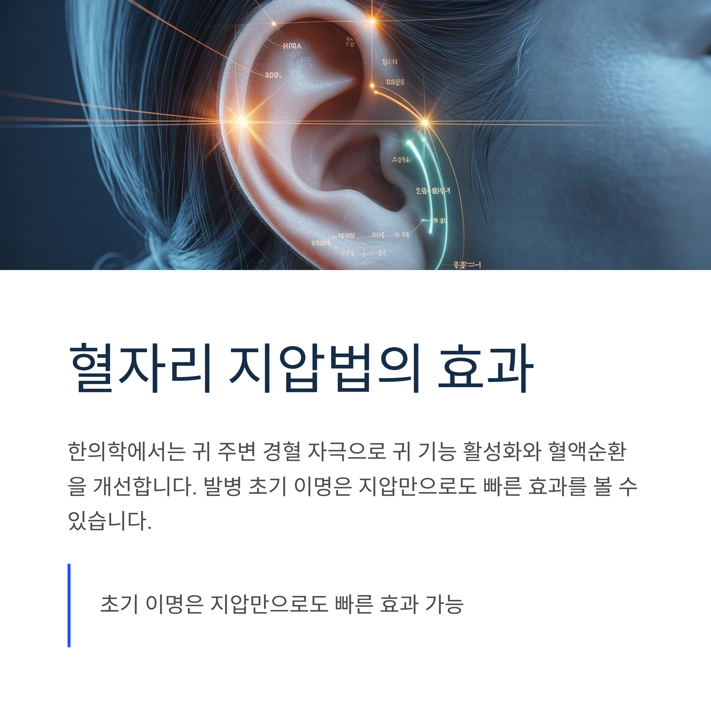 한의학에서는 귀 주변의 경혈을 자극하여 귀의 기능을 활성화하고 혈액순환을 개선하는 방법을 사용합니다. 특히 발병 초기 이명은 지압만으로도 빠른 효과를 볼 수 있습니다.
