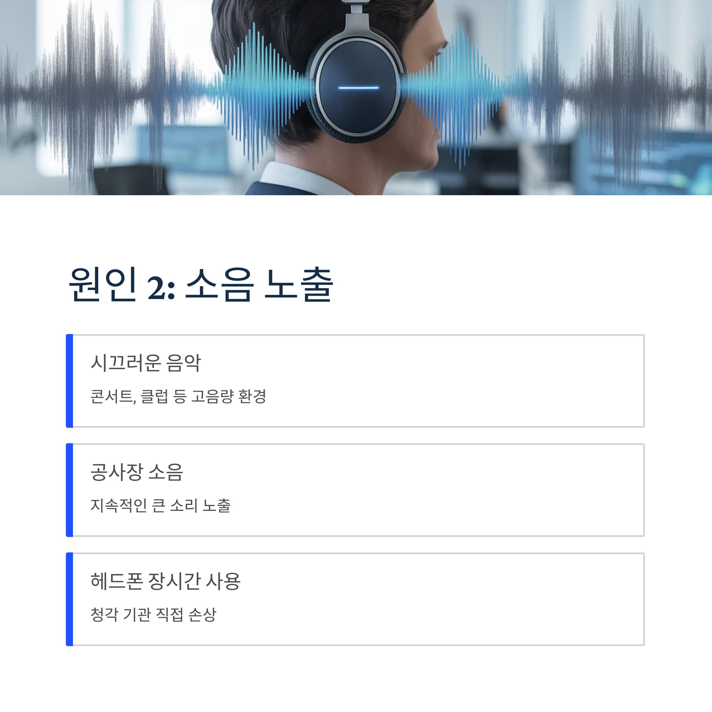 시끄러운 음악, 공사장 소음, 헤드폰 장시간 사용 등으로 청각 기관이 손상되면 이명이 발생합니다.