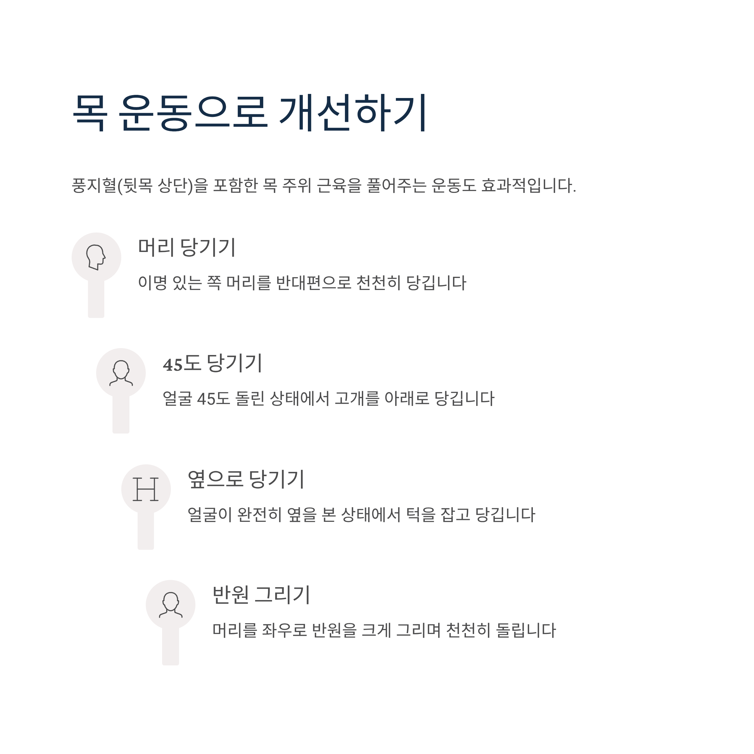 풍지혈(뒷목 상단, 머리와 목의 경계)을 포함한 목 주위 근육을 풀어주는 운동도 효과적입니다.