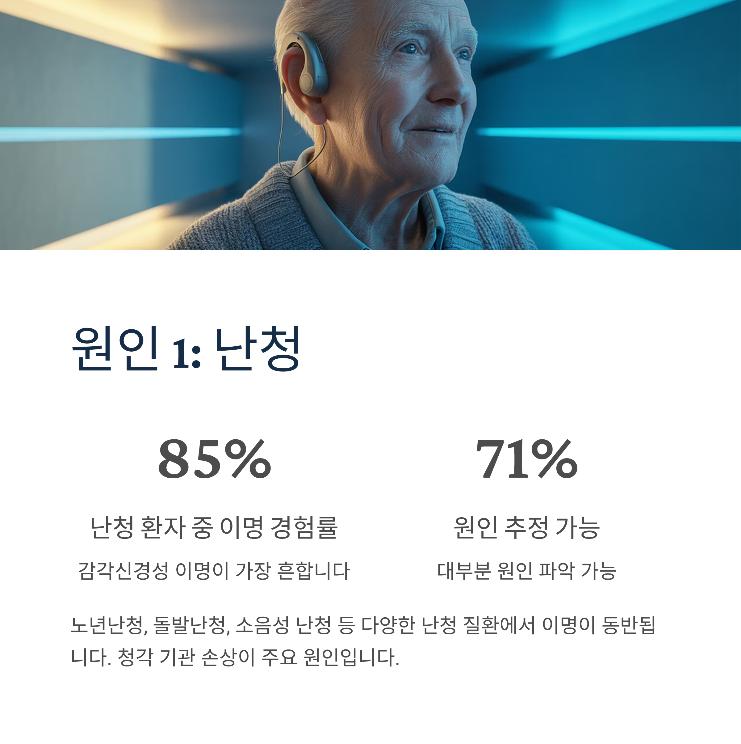 감각신경성 이명이 가장 흔하며, 노년난청, 돌발난청, 소음성 난청 등 다양한 난청 질환에서 이명이 동반됩니다. 난청 환자의 85%가 이명을 경험한다는 통계가 있습니다.