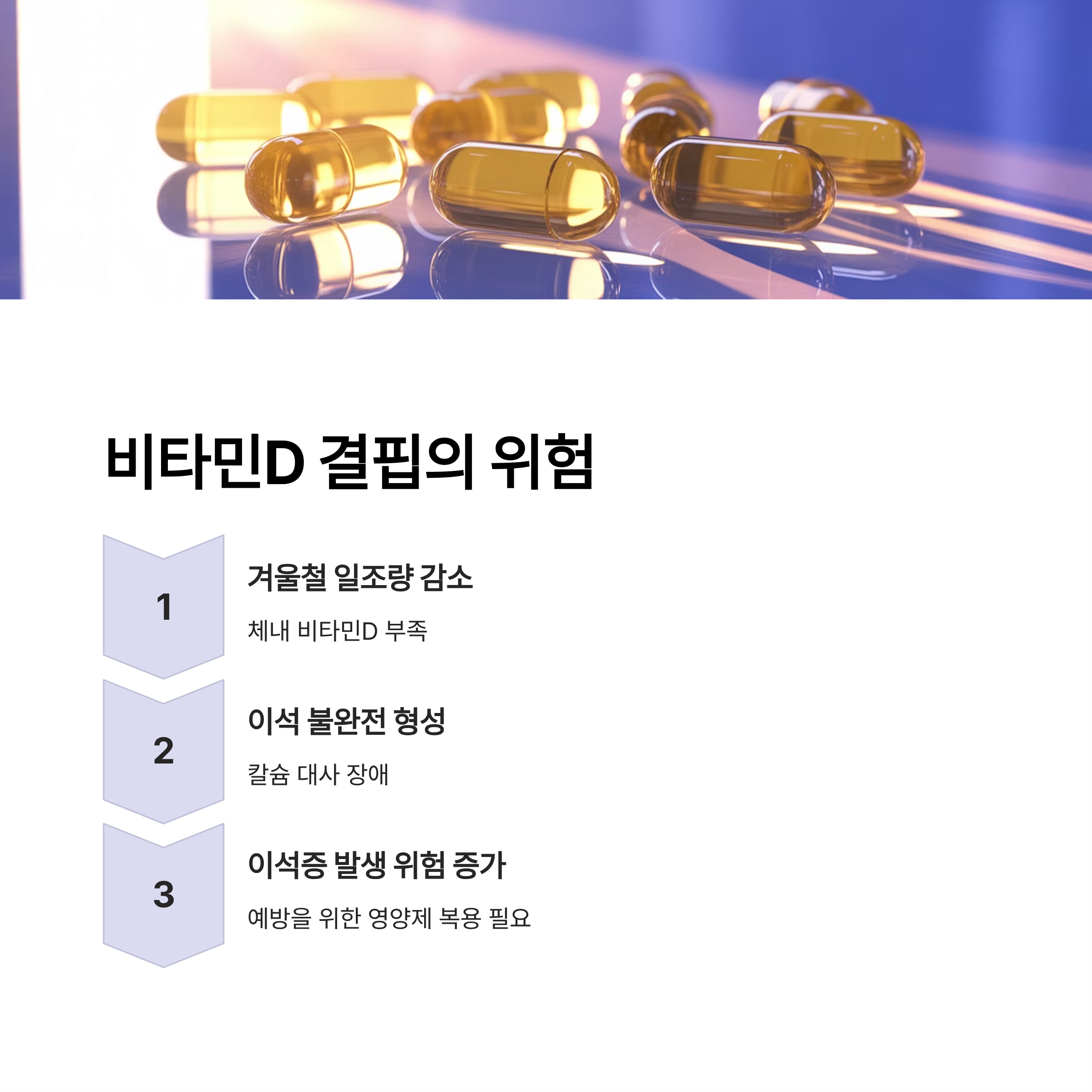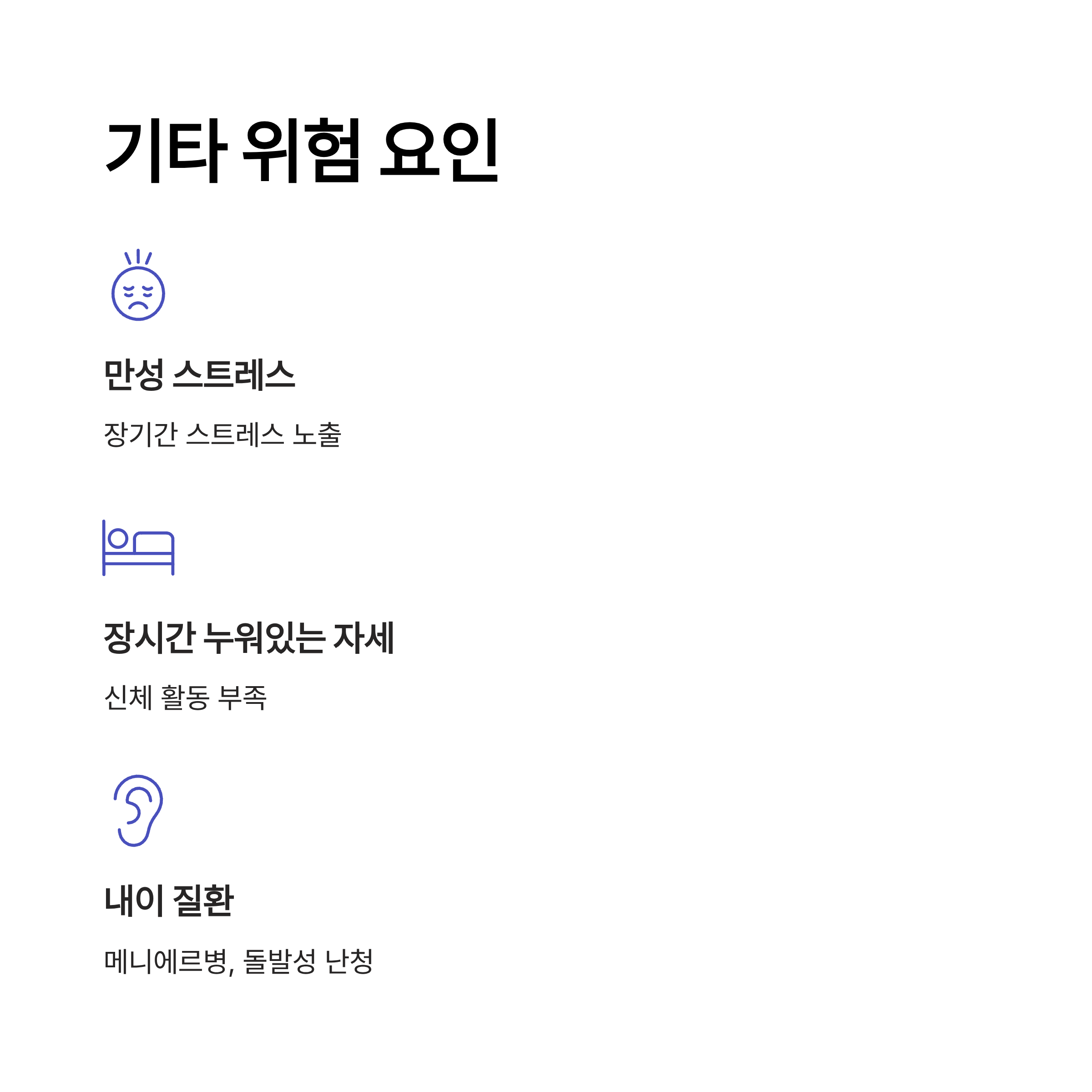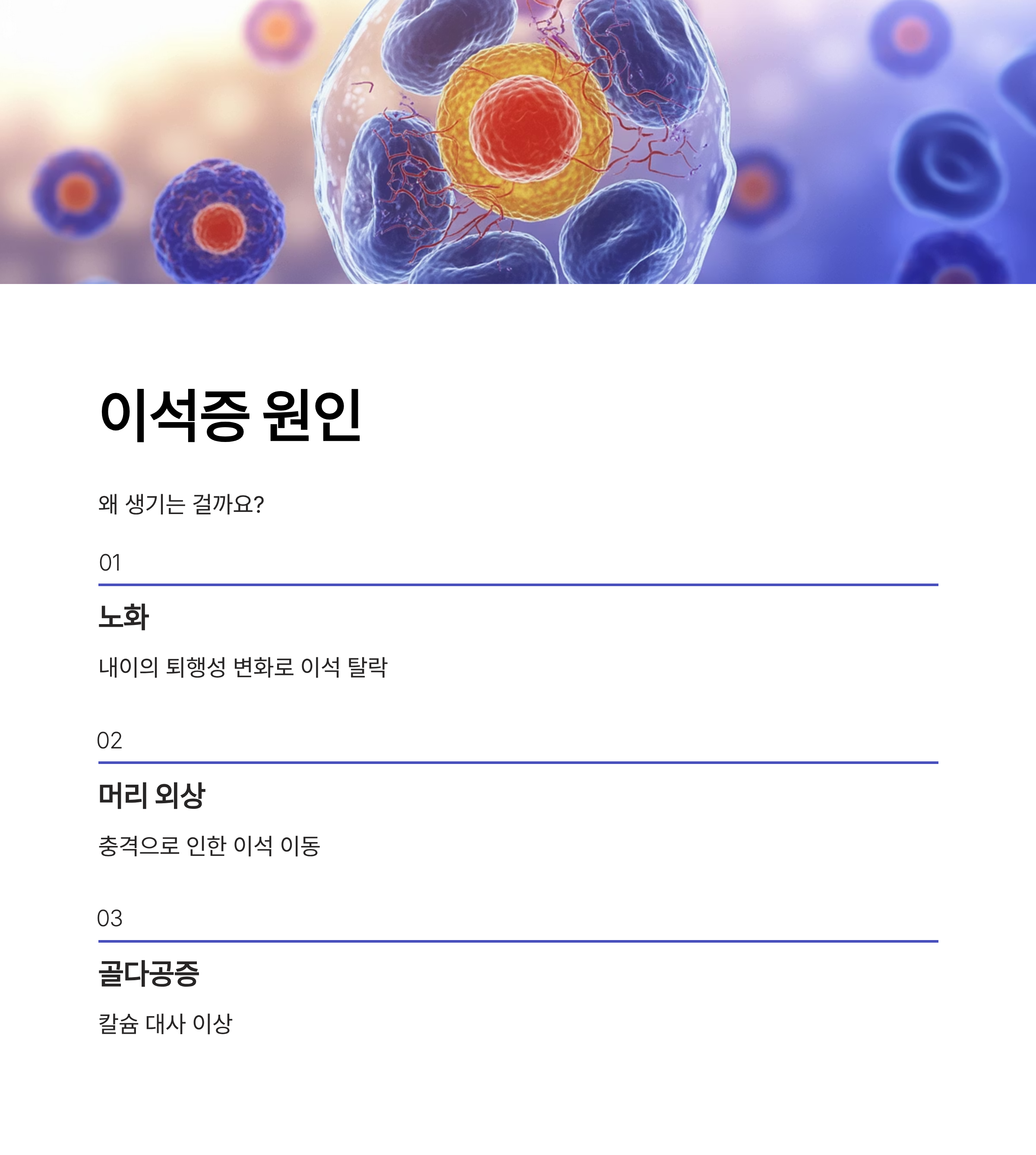 이석증의 가장 큰 원인은 노화입니다. 나이가 들면서 내이의 퇴행성 변화로 이석이 쉽게 떨어져 나올 수 있습니다. 이 외에도 머리 외상, 골다공증, 비타민D 결핍이 주요 위험요인으로 알려져 있습니다. 비타민D는 칼슘 대사에 중요한 역할을 하는데, 겨울철 일조량 감소로 체내 비타민D가 부족해지면 이석이 불완전하게 형성되어 이석증 발생 위험이 높아집니다. 또한 만성 스트레스, 장시간 누워있는 자세, 메니에르병이나 돌발성 난청 같은 내이 질환도 이석증을 유발할 수 있습니다.
