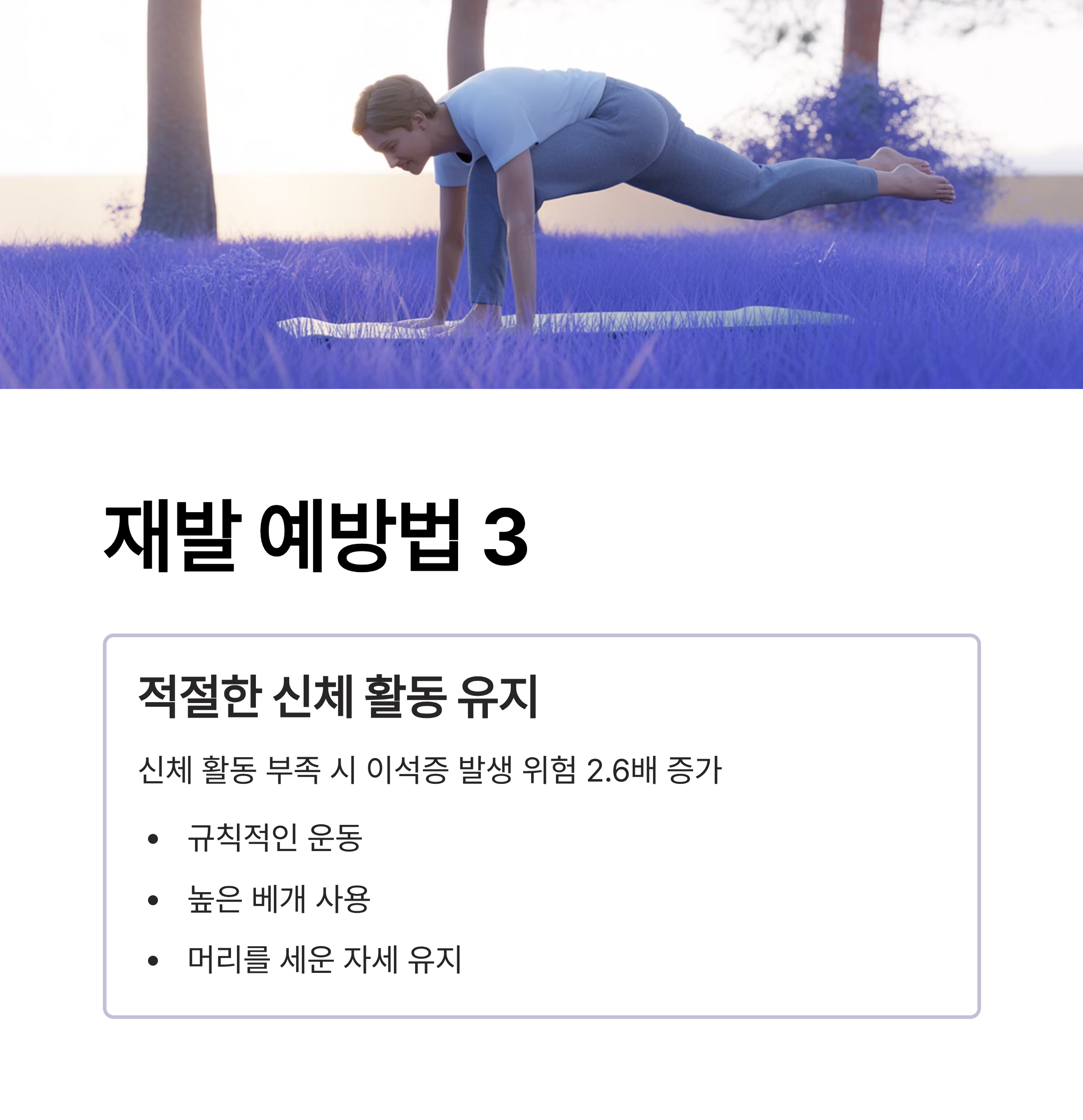이석증은 치료 후에도 약 30%가 재발하는 특징이 있습니다. 재발을 방지하려면 첫째, 비타민D 영양제를 꾸준히 복용하세요. 비타민D 부족은 이석을 약하게 만들어 재발 위험을 높입니다. 둘째, 수면 자세를 바꿔보세요. 이석증이 발생한 반대 방향으로 누워 자는 것이 도움이 됩니다. 셋째, 적절한 신체 활동을 유지하세요. 신체 활동이 부족하면 이석증 발생 위험이 2.6배 증가한다는 연구 결과가 있습니다. 또한 치료 후 며칠간은 높은 베개를 사용하거나 앉아서 자는 등 머리를 세운 자세를 유지하는 것이 좋습니다.