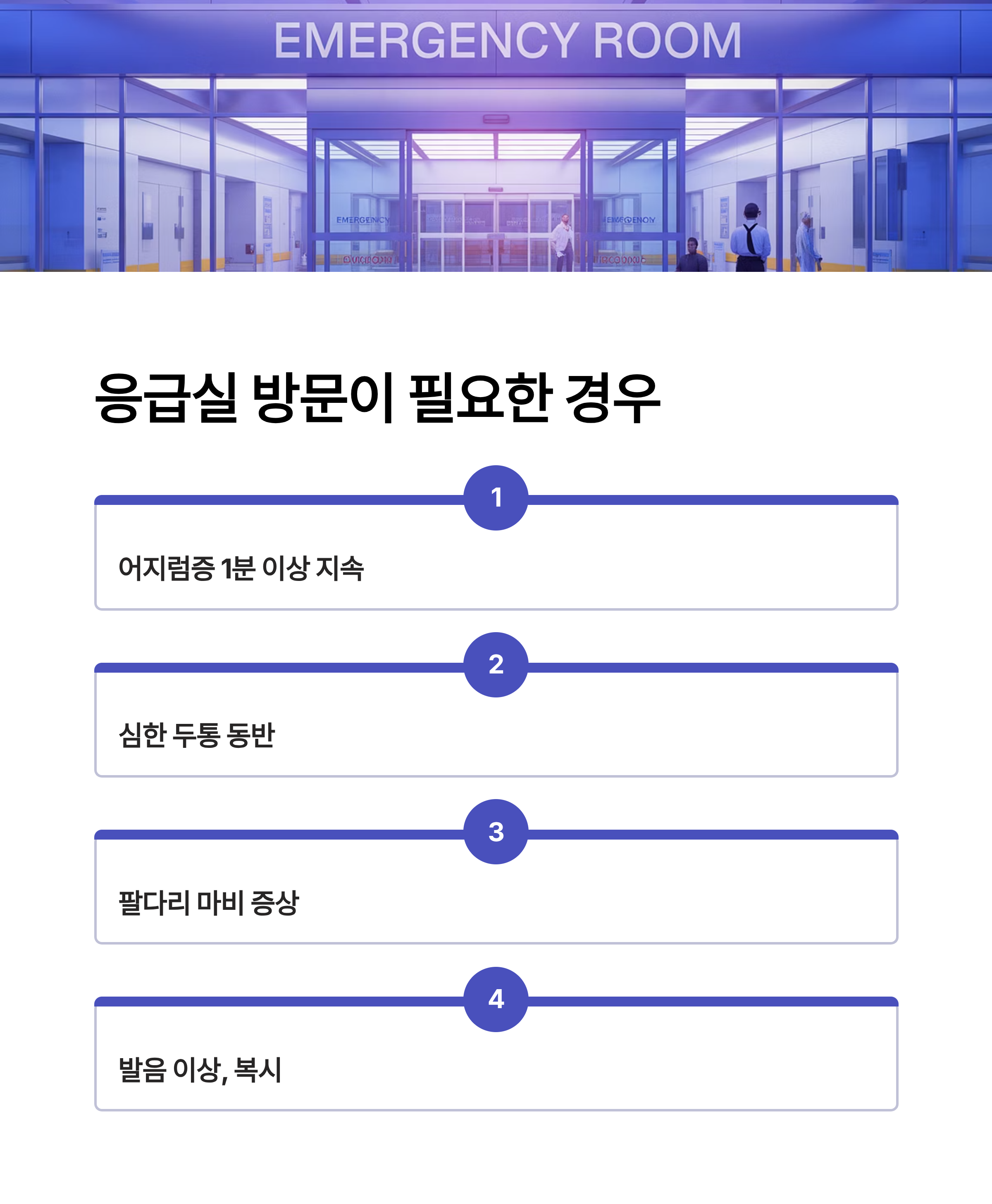 어지럼증이 1분 이상 지속되거나 신경학적 증상(두통, 팔다리 마비, 발음 이상, 복시)이 동반된다면 뇌졸중이나 뇌출혈 같은 중증 뇌질환일 수 있으므로 즉시 응급실을 방문해야 합니다. 이석증은 비교적 간단한 치료로 빠르게 회복할 수 있는 양성 질환이지만, 정확한 진단이 무엇보다 중요합니다.