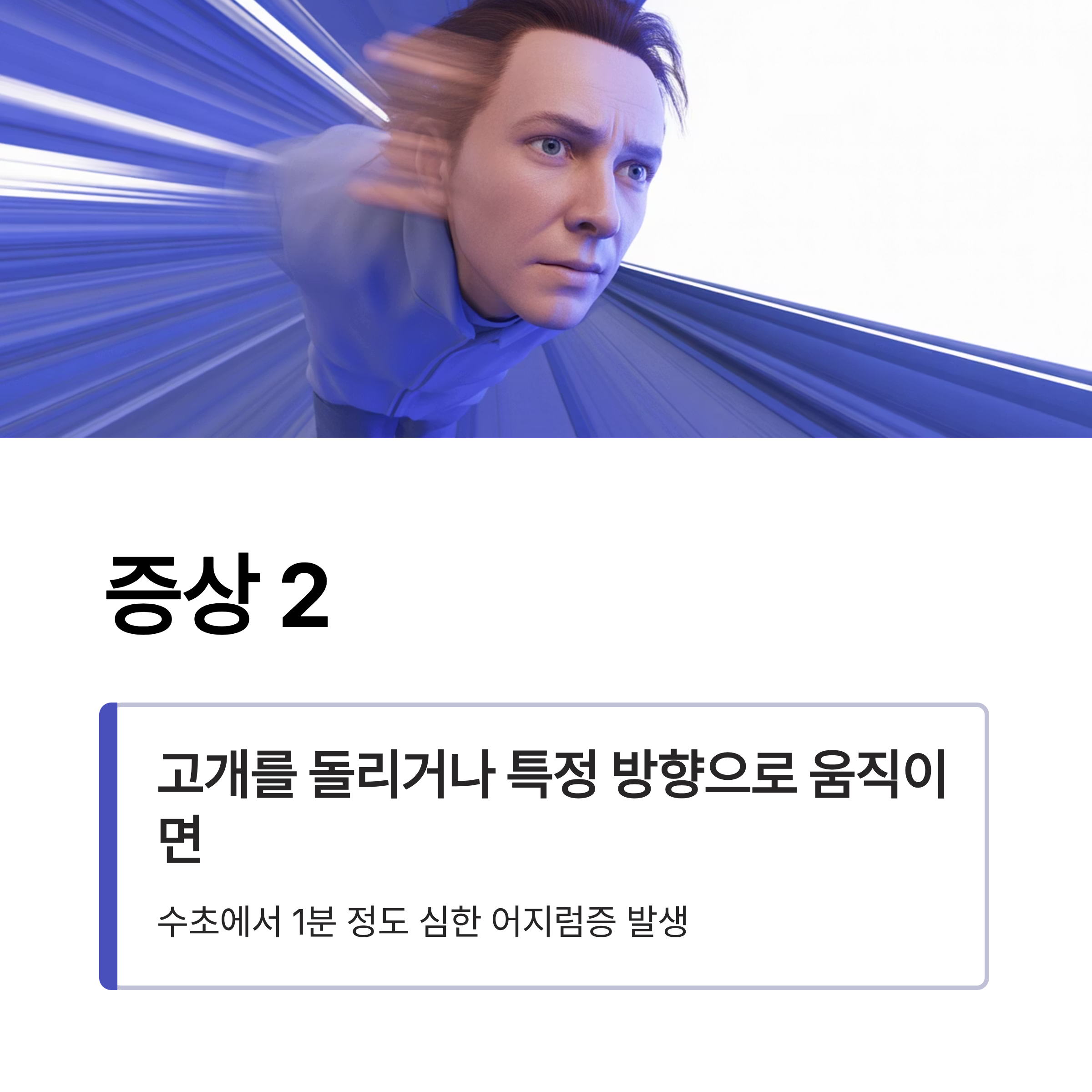 - 고개를 돌리거나 특정 방향으로 움직이면 수초에서 1분 정도 심한 어지럼증이 발생합니다