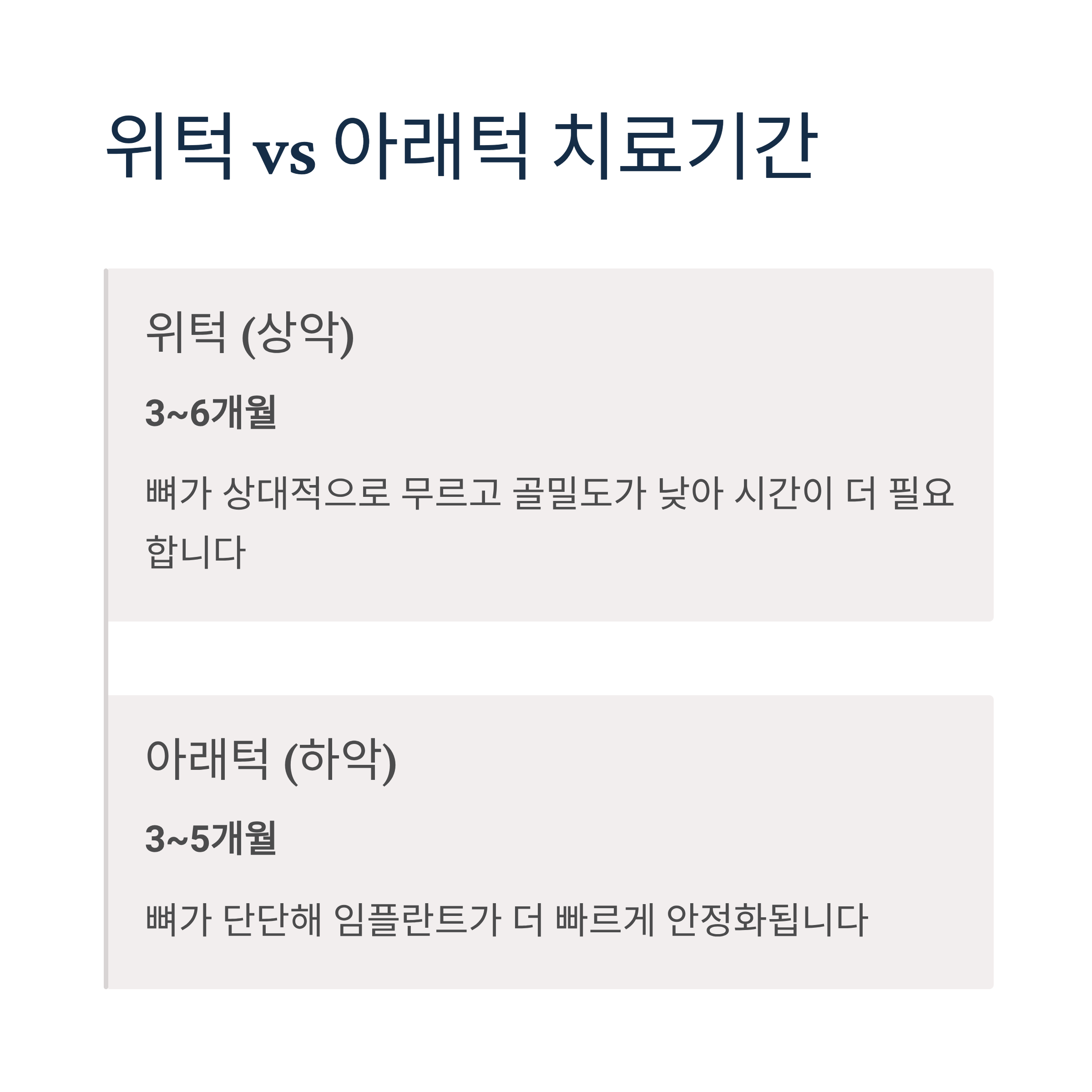 일반적인 임플란트 치료기간은 3~4개월입니다. 잇몸뼈가 건강한 상태라면 짧게는 1.5개월에서 길게는 6개월까지 소요됩니다. 위턱(상악)의 경우 3~6개월, 아래턱(하악)은 3~5개월이 평균입니다. 아래턱이 위턱보다 뼈가 단단하기 때문에 임플란트가 더 빠르게 안정화됩니다.
