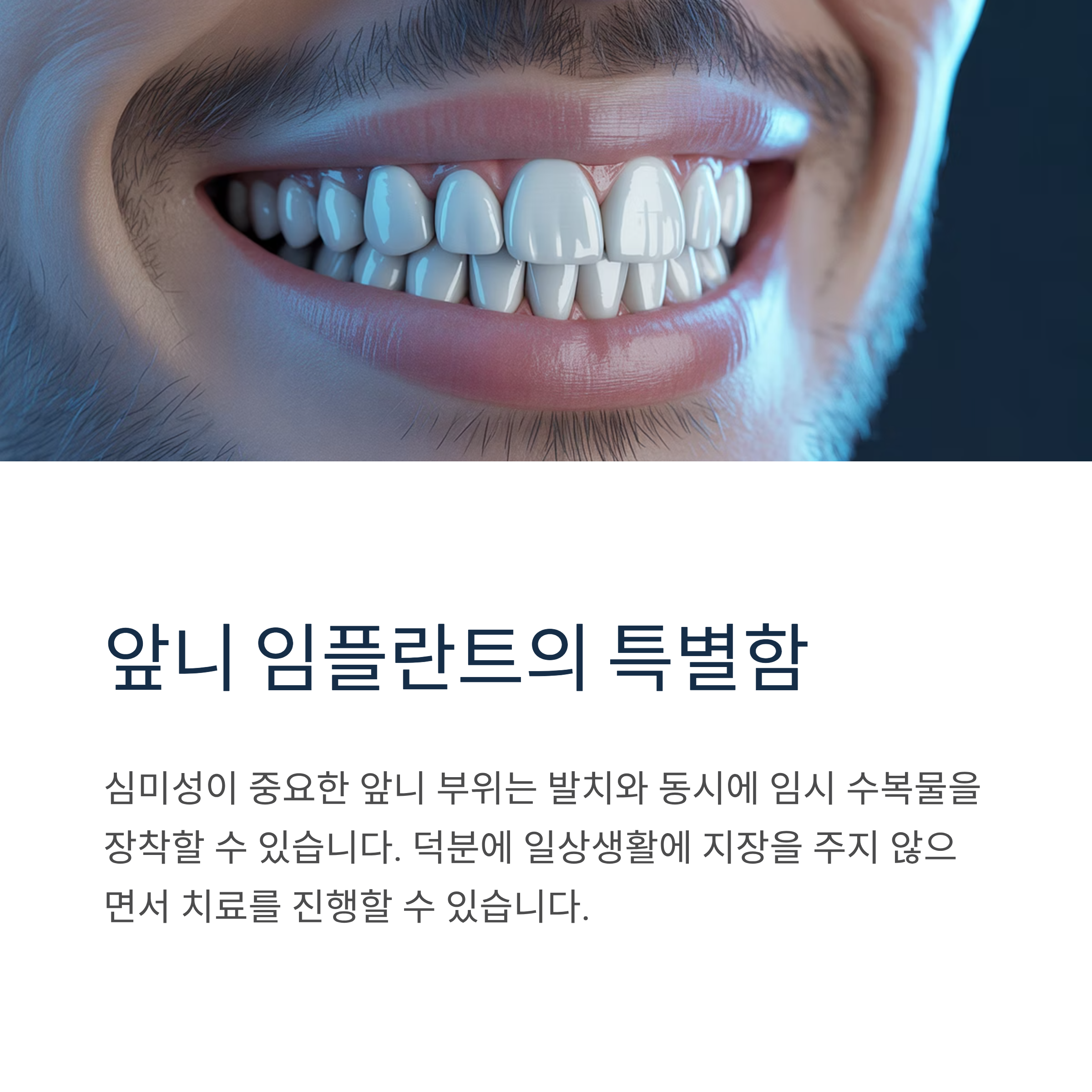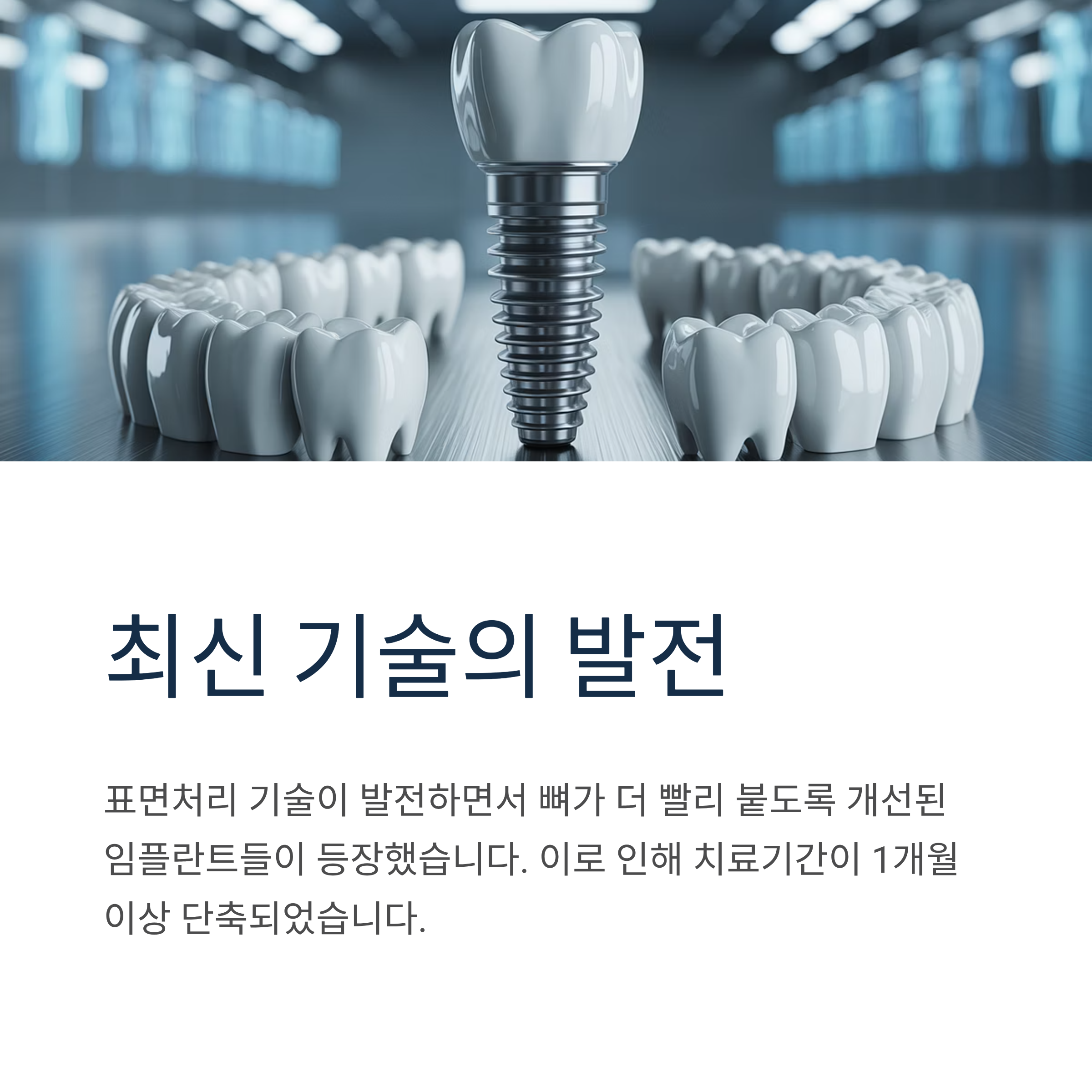 최근에는 표면처리 기술이 발전해 뼈가 더 빨리 붙도록 개선된 임플란트들이 나오면서 1개월 이상 치료기간이 단축되었습니다. 또한 심미성이 중요한 앞니 부위는 발치와 동시에 임시 수복물을 장착할 수 있어 일상생활에 지장을 주지 않습니다.