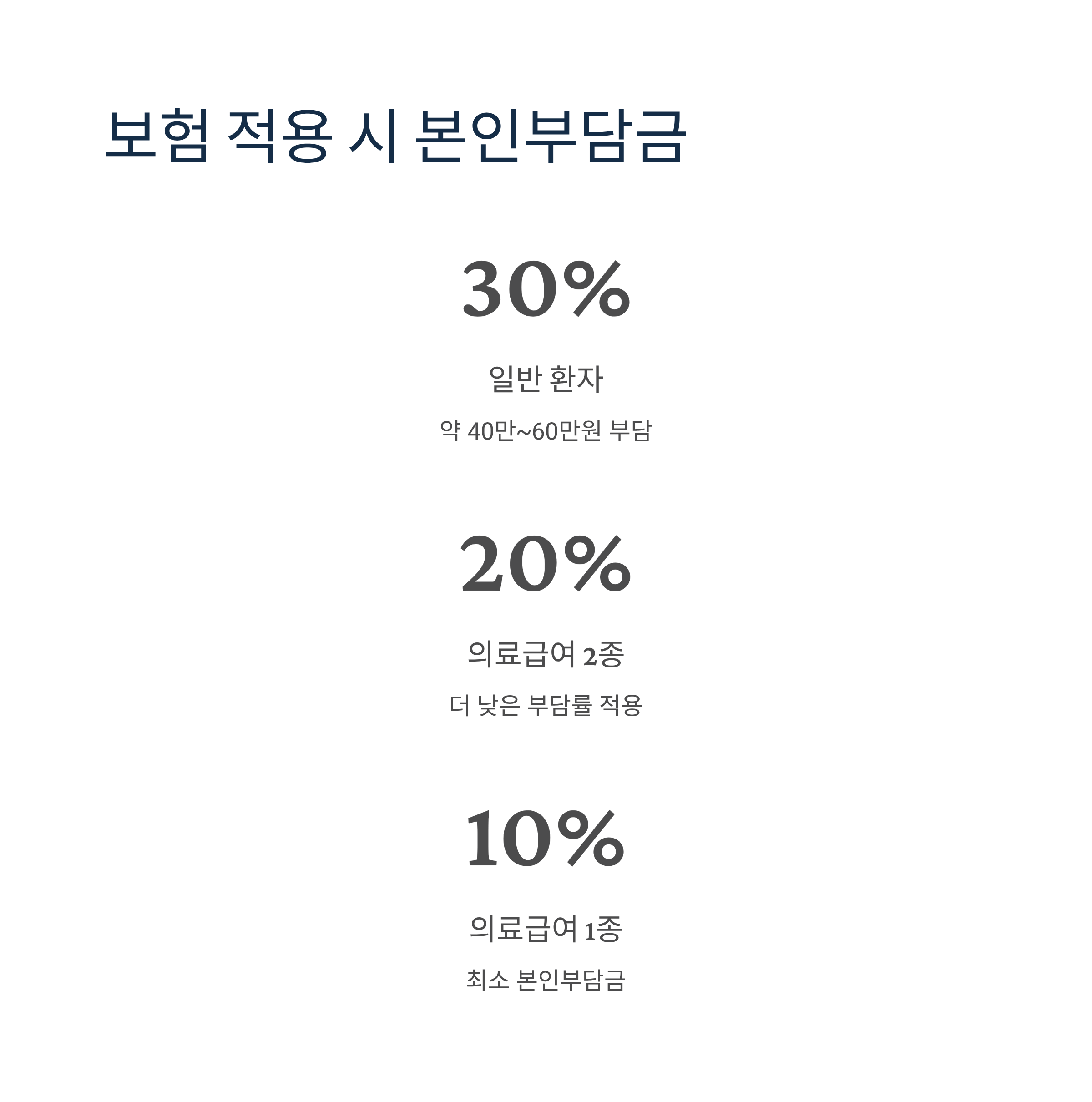 건강보험이 적용되면 전체 비용의 30%만 본인이 부담하게 되어, 2024년 기준 본인부담금은 약 40만~60만원 정도입니다. 차상위계층이나 의료급여 수급자는 더 낮은 부담률을 적용받습니다. 의료급여 2종은 20%, 1종은 10%만 부담하면 됩니다.