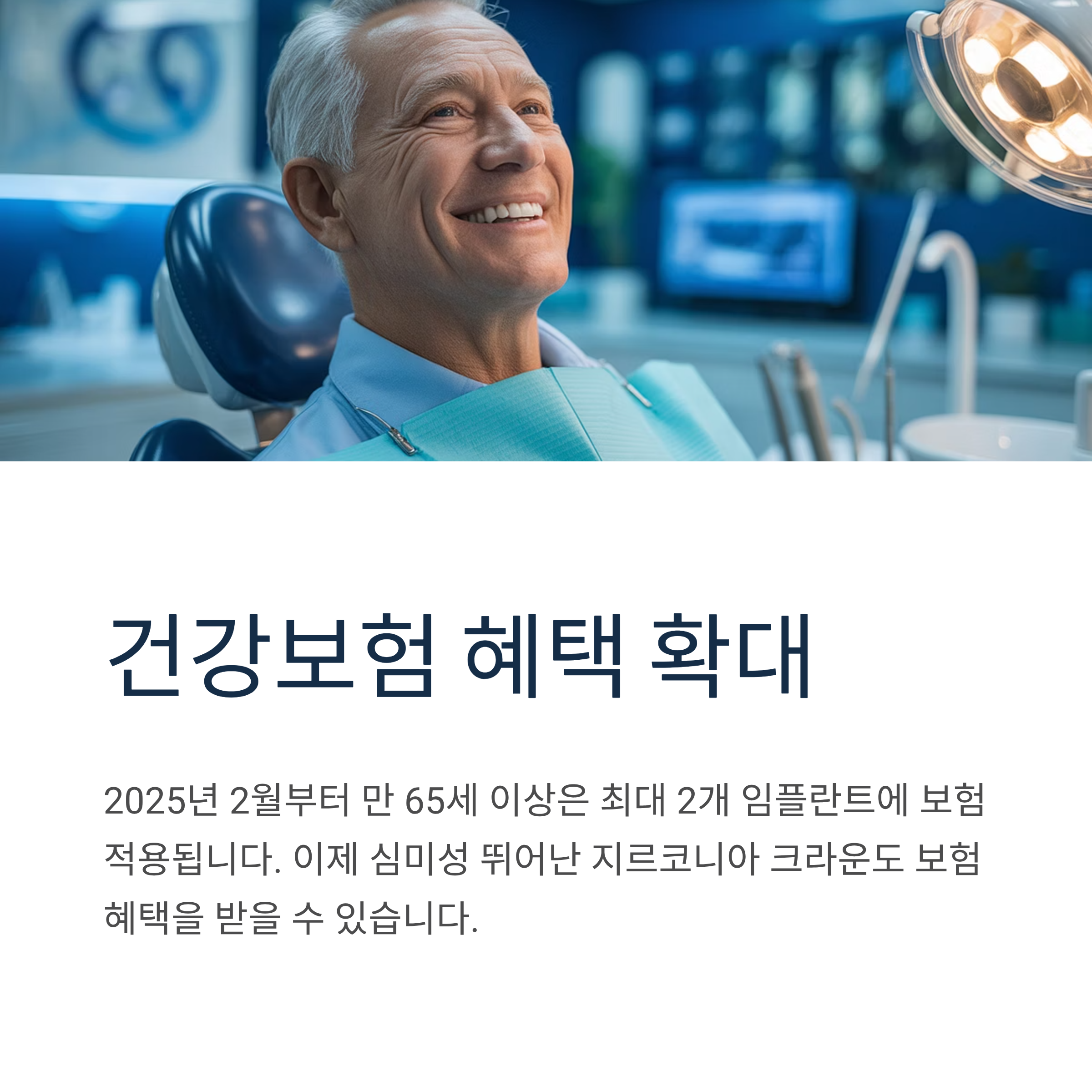 2025년 2월부터 임플란트 건강보험 혜택이 확대되었습니다. 만 65세 이상이라면 1인당 최대 2개의 임플란트에 보험 혜택을 받을 수 있습니다. 기존에는 PFM(금속도자기) 크라운만 보험 적용이 가능했지만, 이제는 심미성이 뛰어난 지르코니아 크라운도 보험 적용이 됩니다.