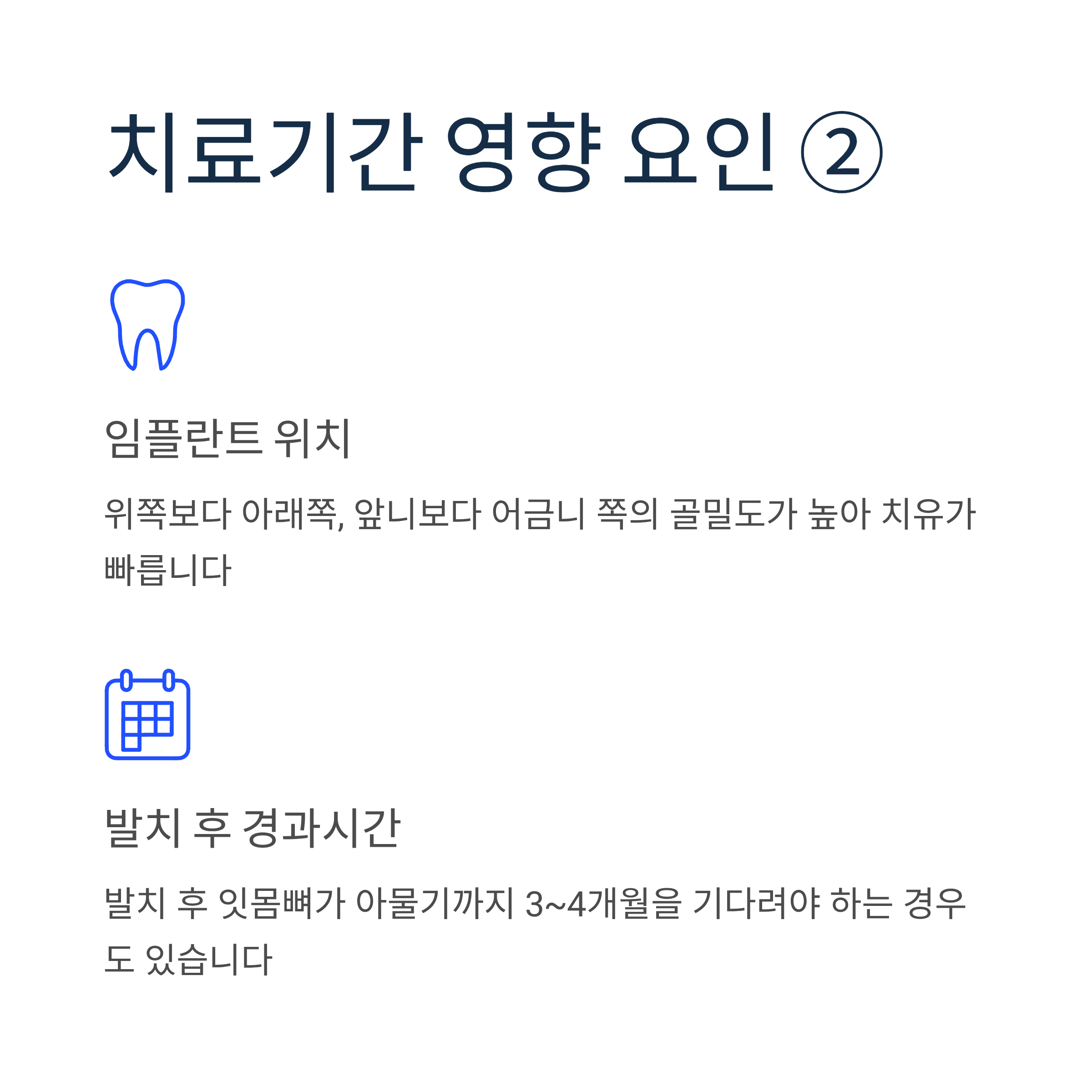 셋째, 임플란트 위치에 따라 차이가 납니다. 일반적으로 위쪽보다 아래쪽, 앞니보다 어금니 쪽의 골밀도가 높아 치유가 빠릅니다. 넷째, 발치 후 경과시간도 중요합니다. 발치 후 잇몸뼈가 아물기까지 3~4개월을 기다려야 하는 경우도 있습니다.