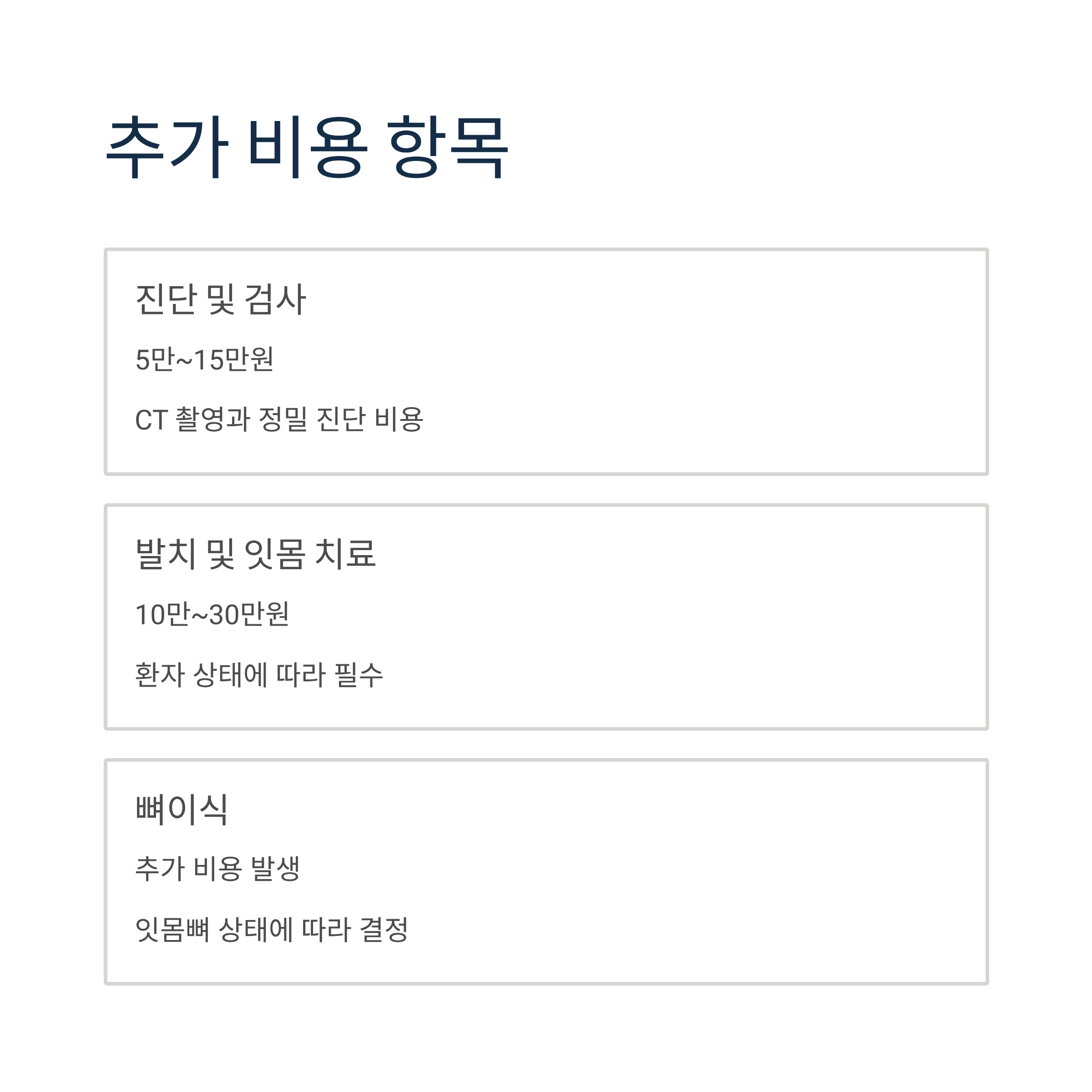 셋째, 지역과 병원 규모가 중요합니다. 서울 강남이나 대형 대학병원은 동일한 시술이라도 기본 단가가 높습니다. 넷째, 환자의 잇몸 상태와 뼈이식 여부에 따라 추가 비용이 발생합니다. 진단 및 검사비용으로 5만~15만원, 발치 및 잇몸 치료비로 10만~30만원이 추가될 수 있습니다.