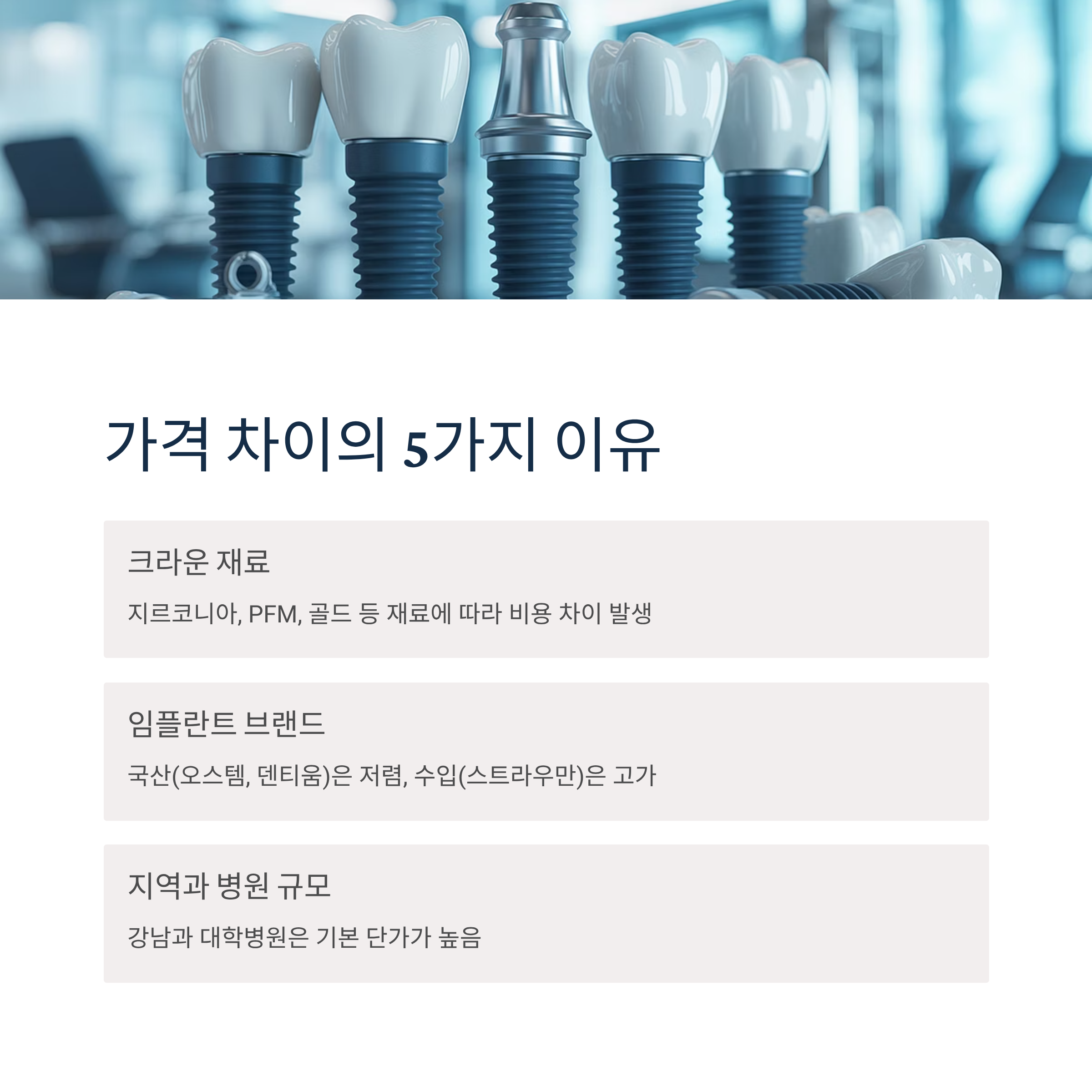 이렇게 가격 차이가 나는 이유는 무엇일까요? 첫째, 크라운 재료에 따라 가격이 달라집니다. 치아 머리 역할을 하는 크라운은 지르코니아, PFM(금속도자기), 골드 등 재료에 따라 비용이 크게 차이가 납니다. 둘째, 임플란트 브랜드도 영향을 미칩니다. 국산 임플란트인 오스템, 덴티움, 디오 등은 상대적으로 저렴하고, 수입 브랜드인 스트라우만, 노벨바이오케어, 아스트라 등은 고가입니다.