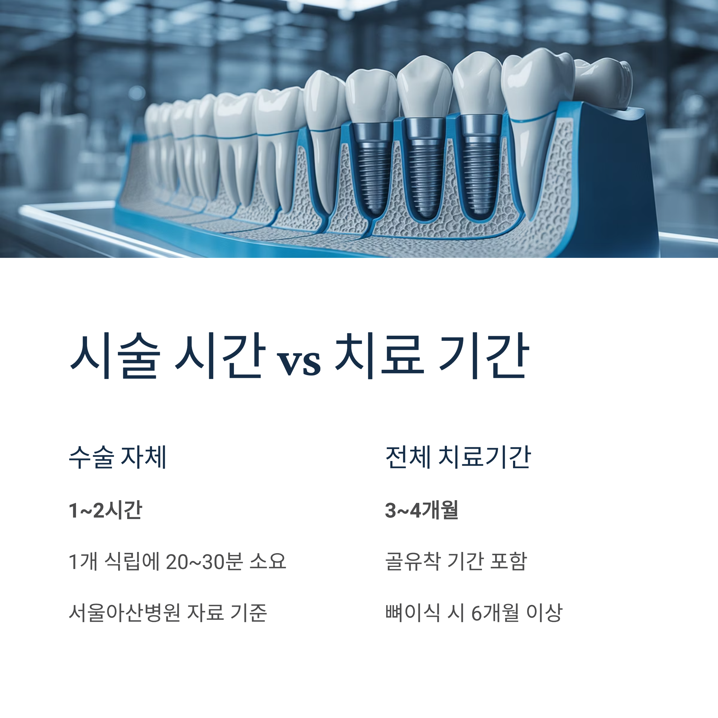 임플란트 수술 자체는 1~2시간이면 끝납니다. 서울아산병원 자료에 따르면 1개 식립에 20~30분 정도 소요됩니다. 하지만 전체 치료기간은 임플란트 픽스쳐가 잇몸뼈와 결합하는 골유착 기간 때문에 훨씬 깁니다.
