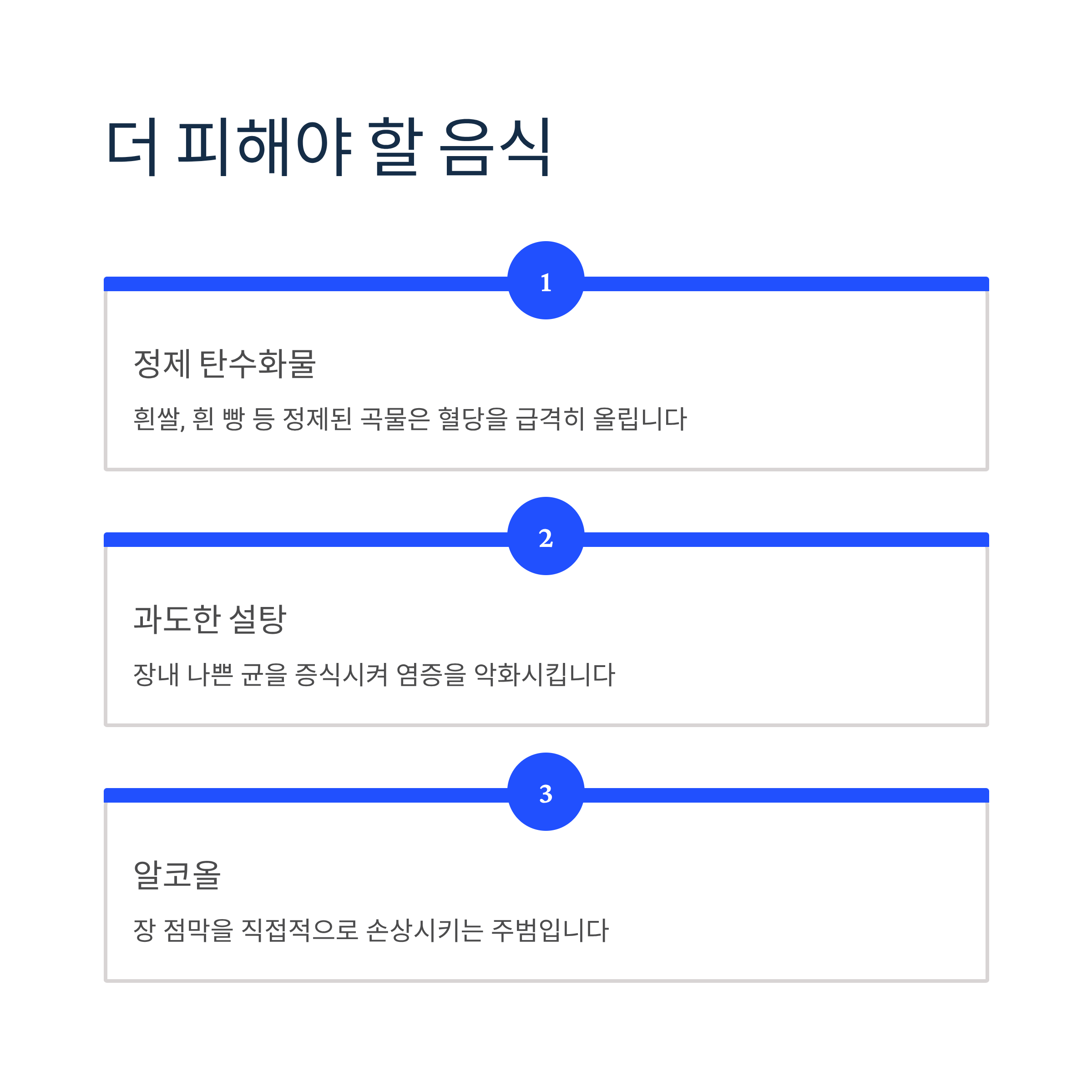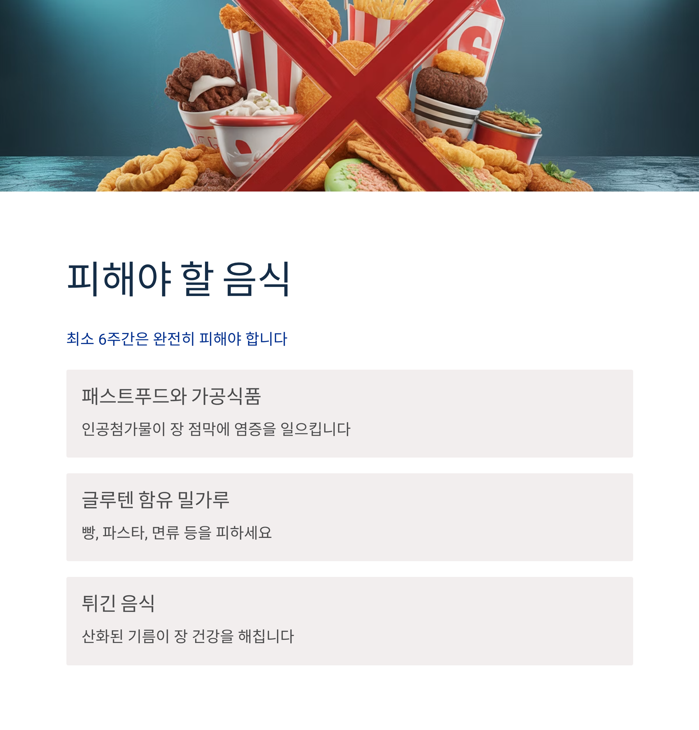 패스트푸드와 가공식품, 글루텐이 함유된 밀가루 음식, 튀긴 음식, 정제 탄수화물, 과도한 설탕과 알코올은 장 점막에 염증을 일으키므로 최소 6주간은 완전히 피해야 합니다.