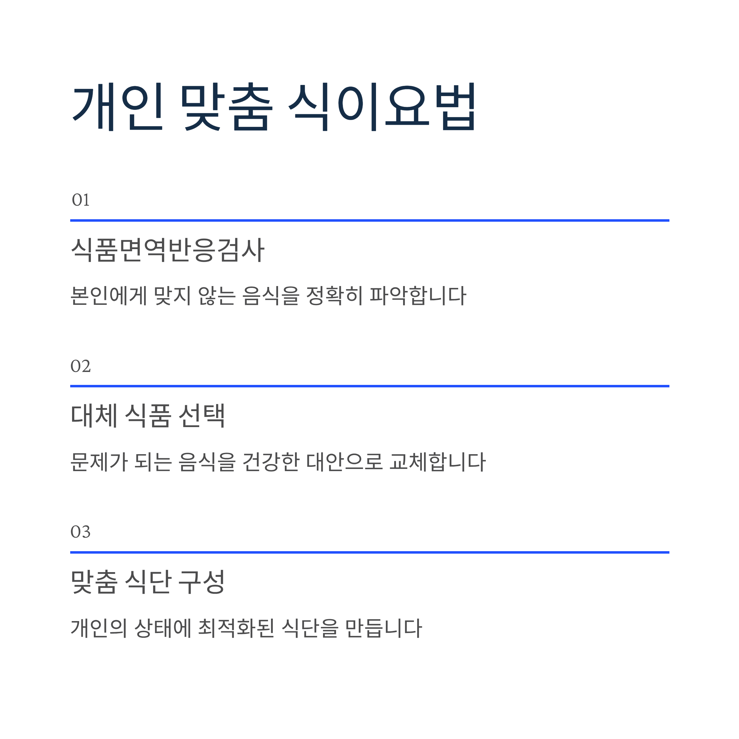 식품면역반응검사를 통해 본인에게 맞지 않는 음식을 파악하고 대체 식품으로 식단을 구성하는 것도 효과적입니다.