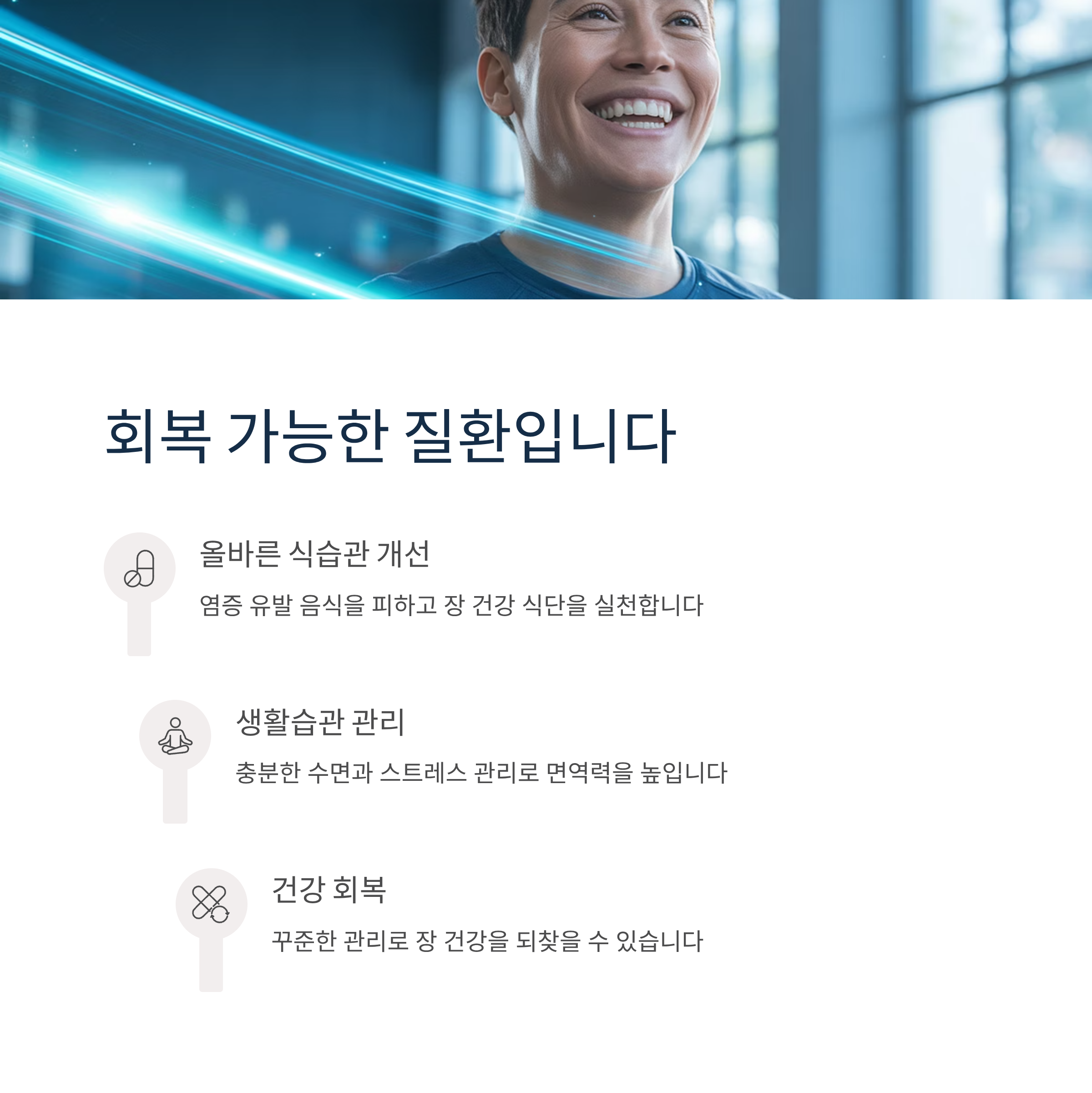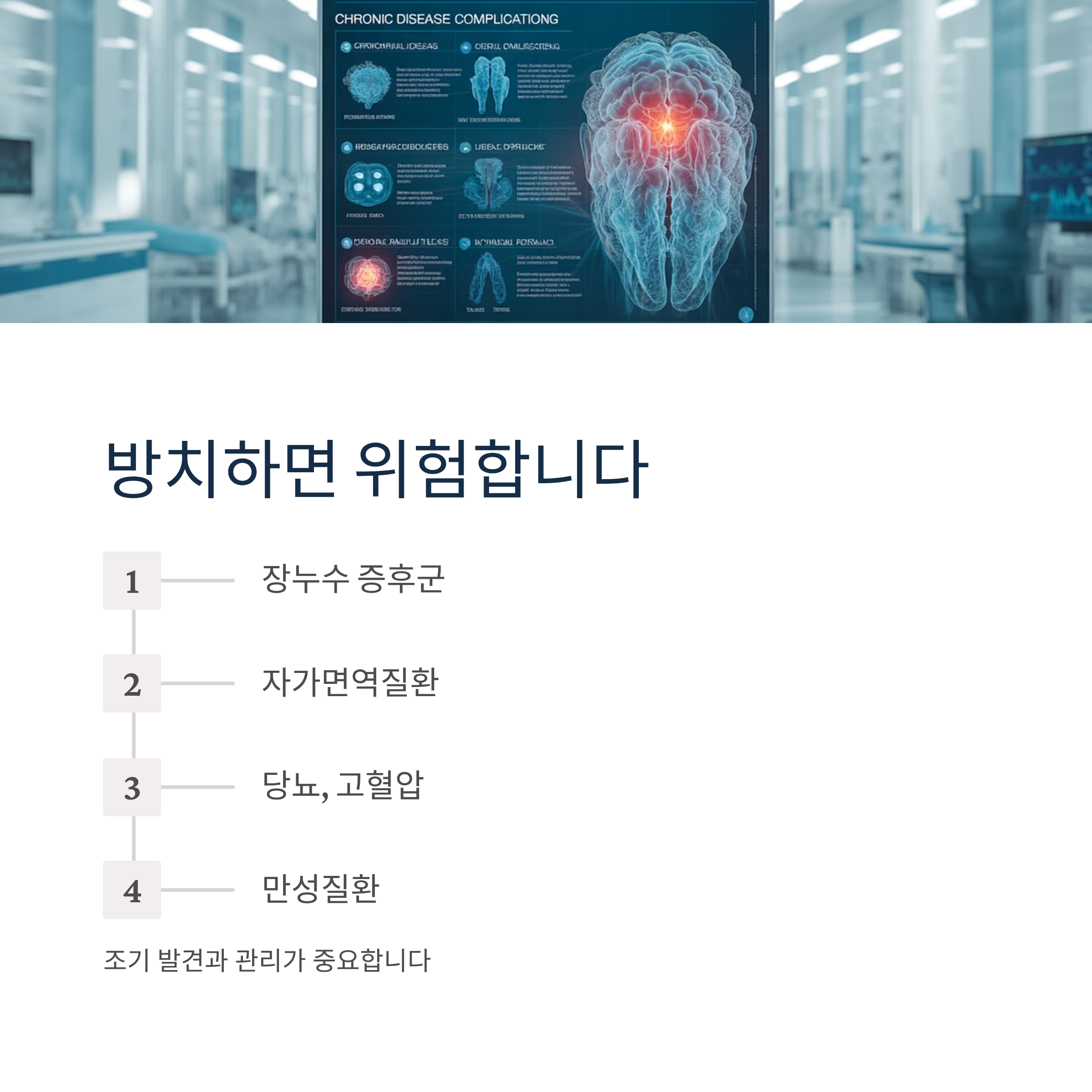 장누수 증후군은 방치하면 자가면역질환, 당뇨, 고혈압 등 각종 만성질환으로 이어질 수 있습니다. 하지만 올바른 식습관 개선과 생활습관 관리로 충분히 회복할 수 있는 질환입니다. 지속적인 소화 불편감이나 원인 모를 전신 증상이 있다면 전문의와 상담하여 정확한 진단을 받아보시기 바랍니다.