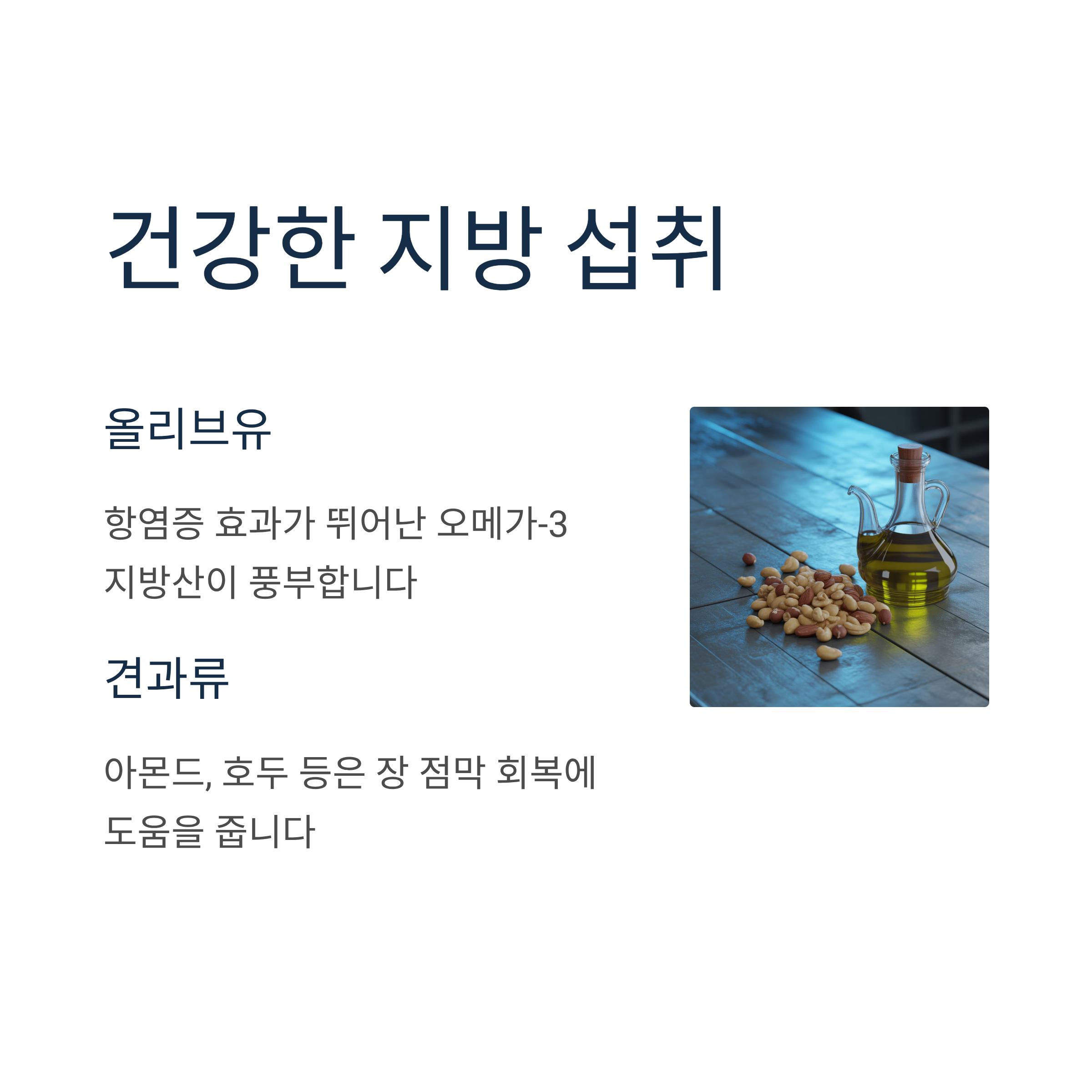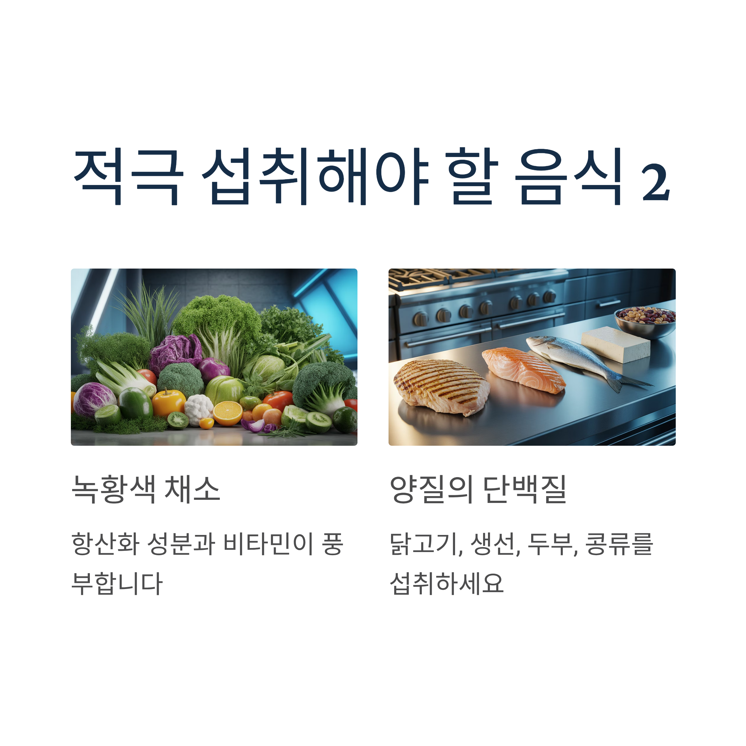 유산균(프로바이오틱스)과 프리바이오틱스 성분이 풍부한 발효식품을 섭취하고, 항산화 성분과 비타민이 많은 녹황색 채소를 충분히 먹는 것이 좋습니다. 닭고기, 생선, 두부, 콩류 등 양질의 단백질과 올리브유, 견과류 같은 건강한 지방을 섭취하세요.