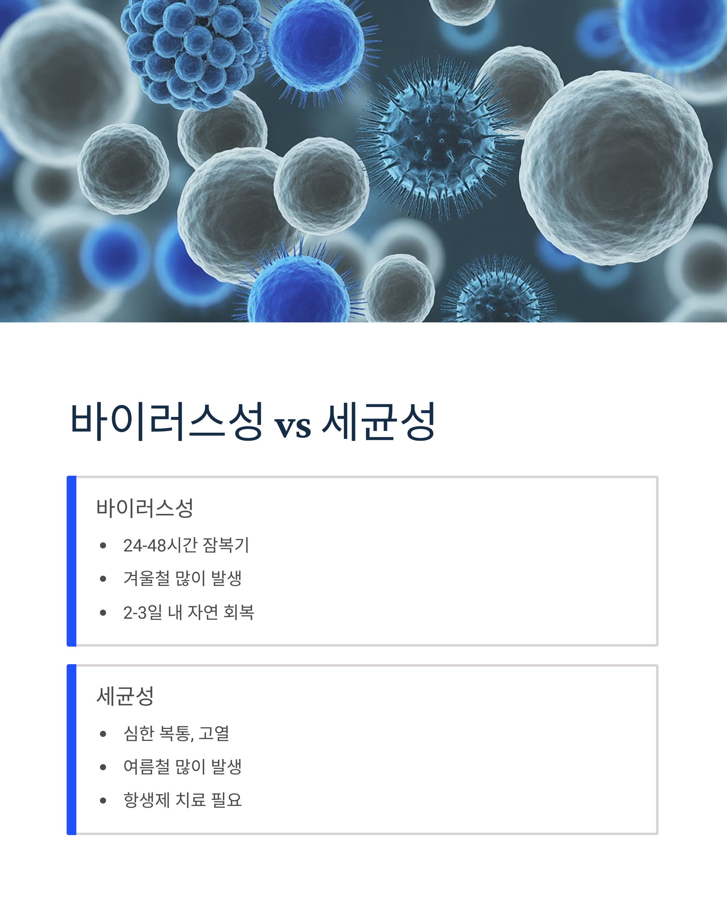 | 대표 원인 | 노로바이러스, 로타바이러스 | 살모넬라, 이질균, 대장균 |