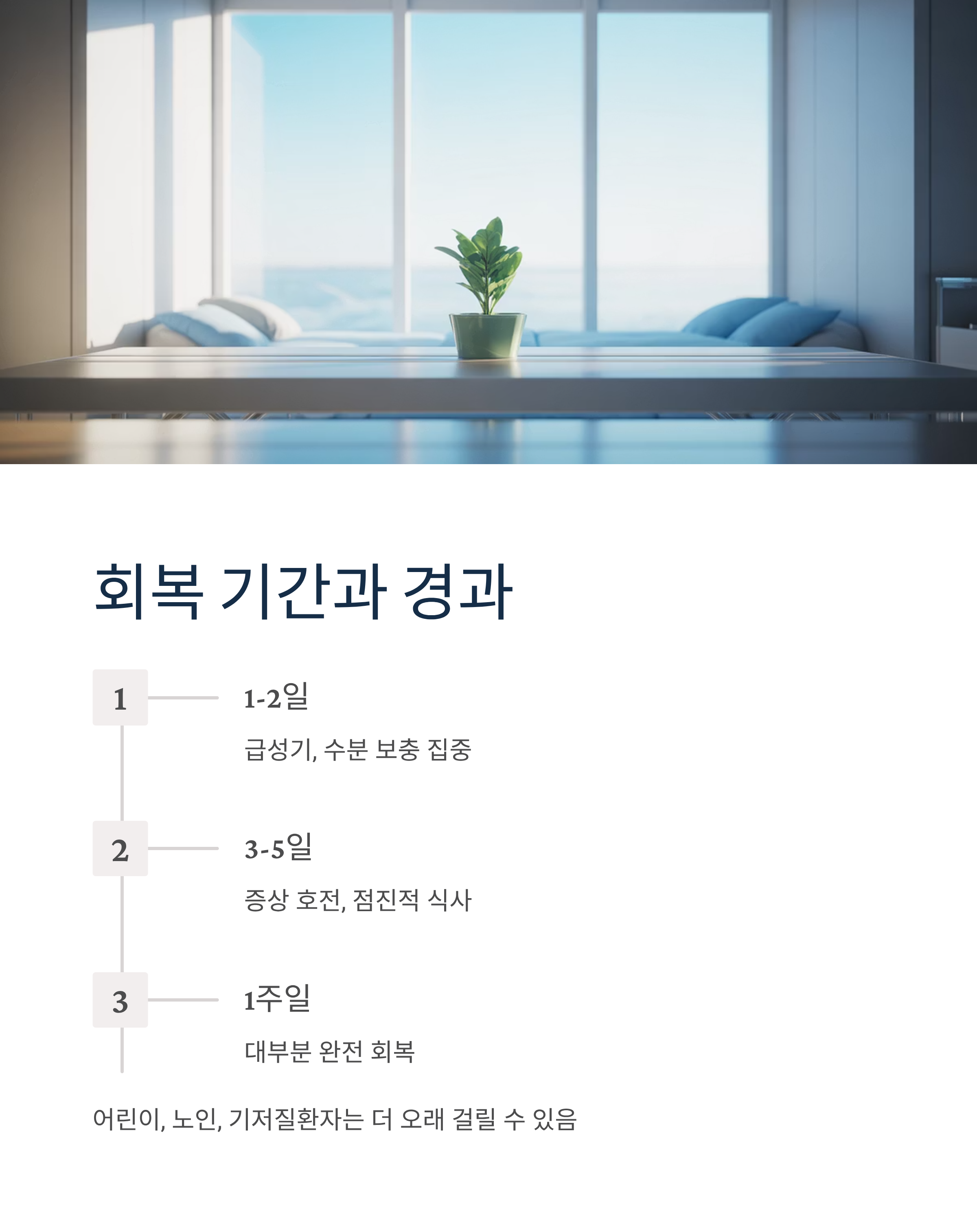 초기 1~2일은 금식을 유지하며 수분과 전해질을 보충합니다. 증상이 호전되면 미음 → 죽 → 밥 순서로 식사를 진행합니다.