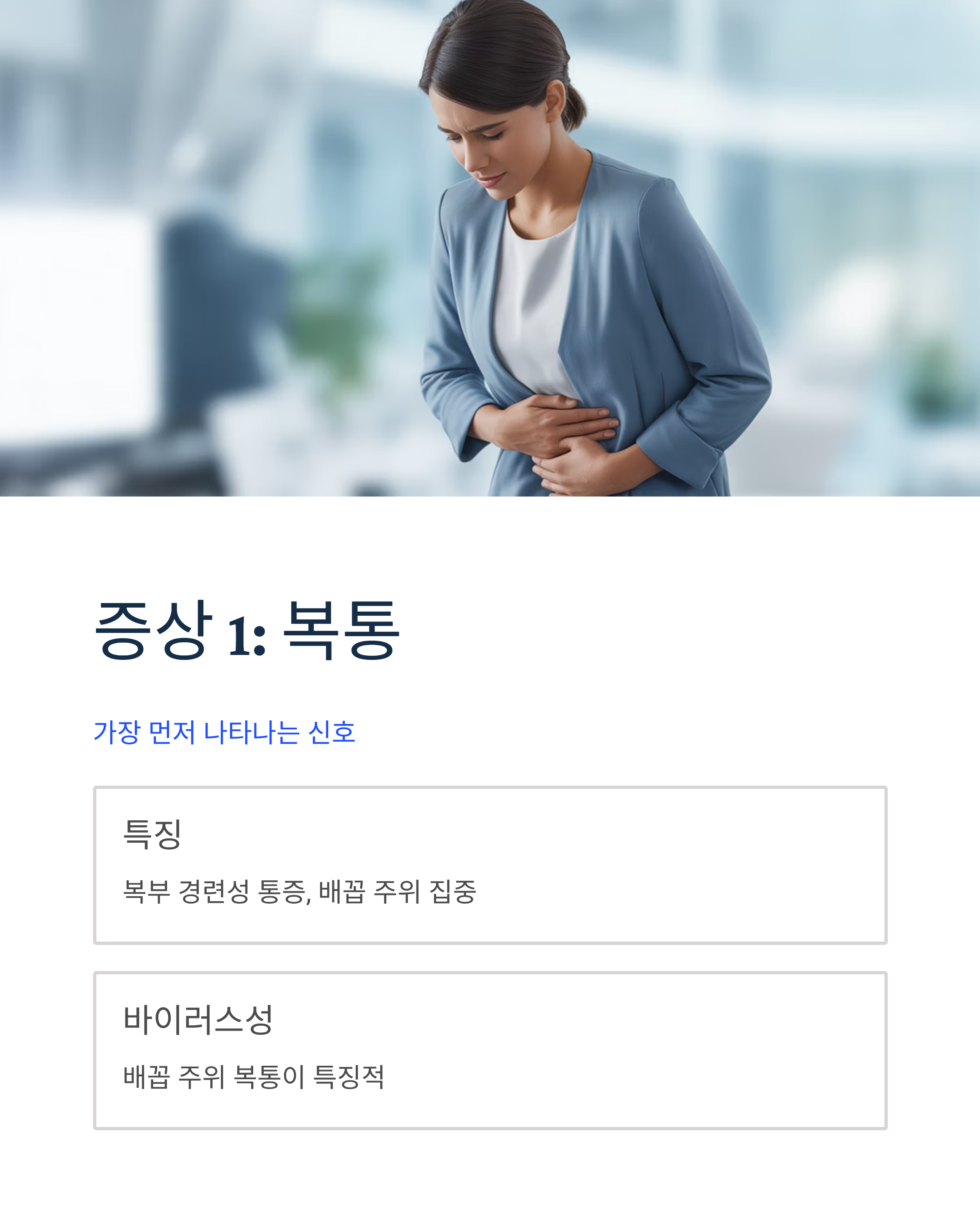 복부에 경련성 통증이 나타나며, 이는 복부 경련, 복통 등의 형태로 나타납니다. 배꼽 주위에 통증이 집중되는 경우가 많으며, 특히 바이러스성 장염의 경우 배꼽 주위 복통이 특징적입니다.
