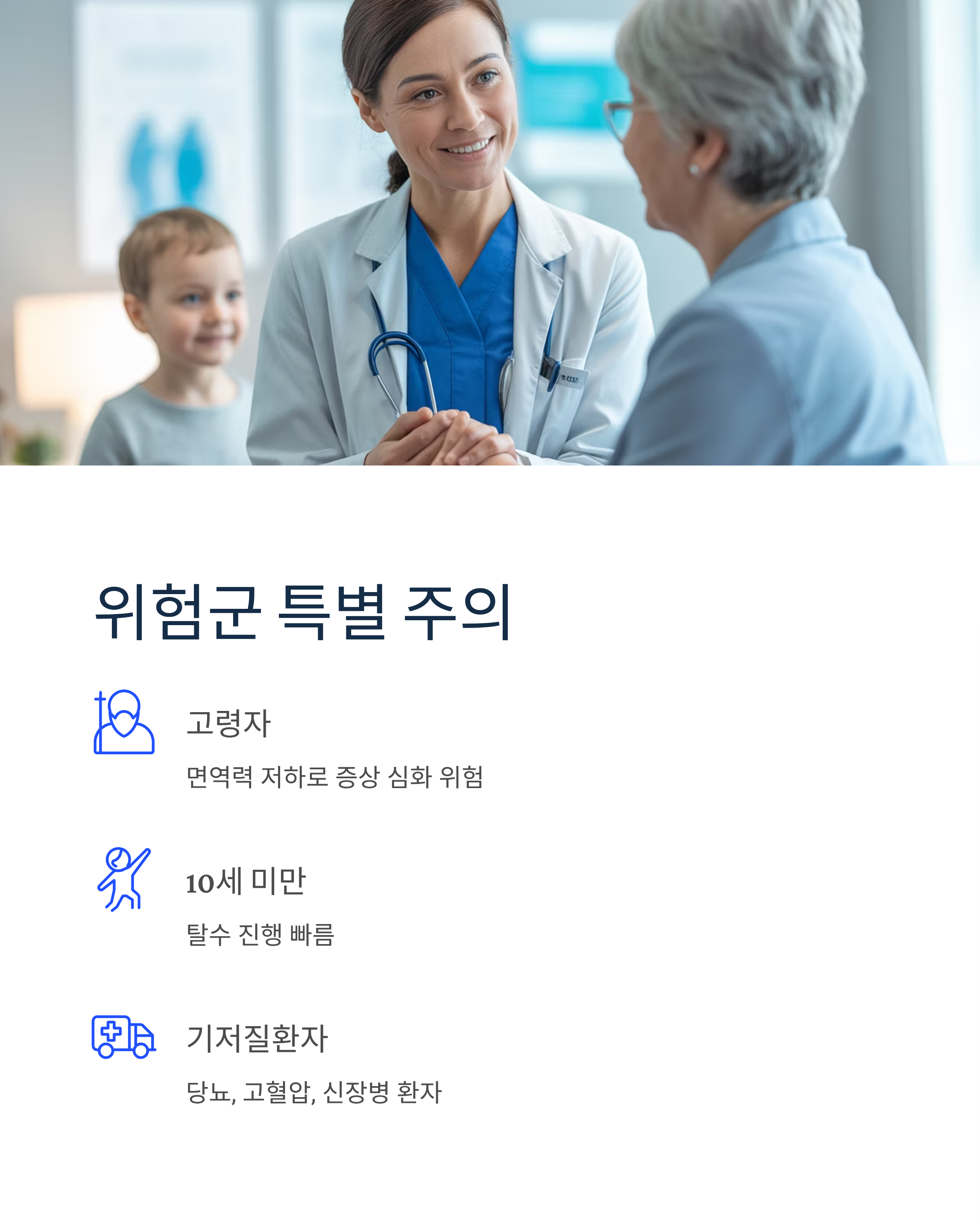 - 심한 탈수 증상 (소변량 급격히 감소, 입 마름)