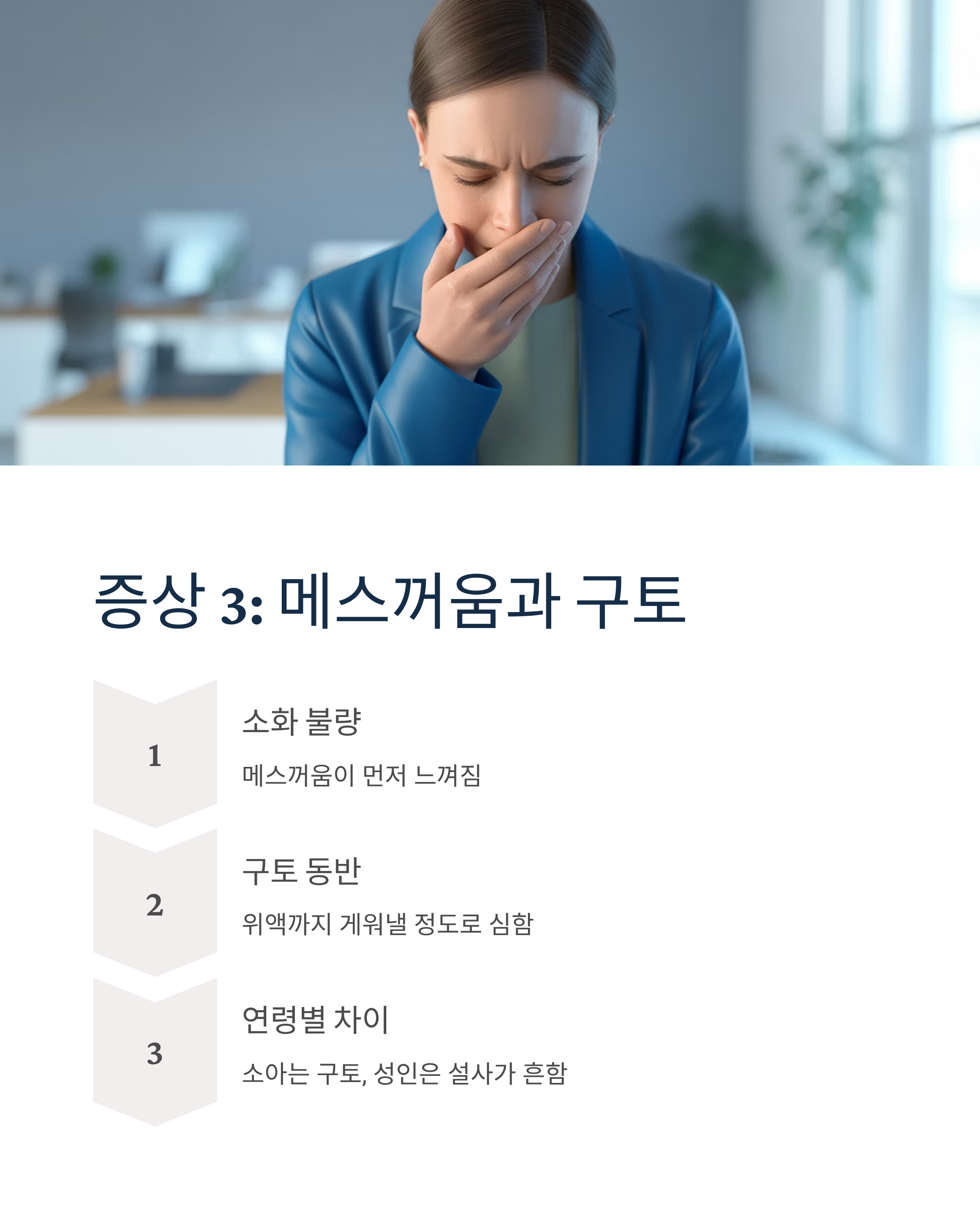 소화 불량과 함께 메스꺼움이 느껴지며, 구토가 동반됩니다. 먹은 게 없어도 위액까지 게워낼 정도로 심한 구토를 하기도 합니다. 소아는 구토가 흔하고, 성인은 설사가 더 흔한 편입니다.