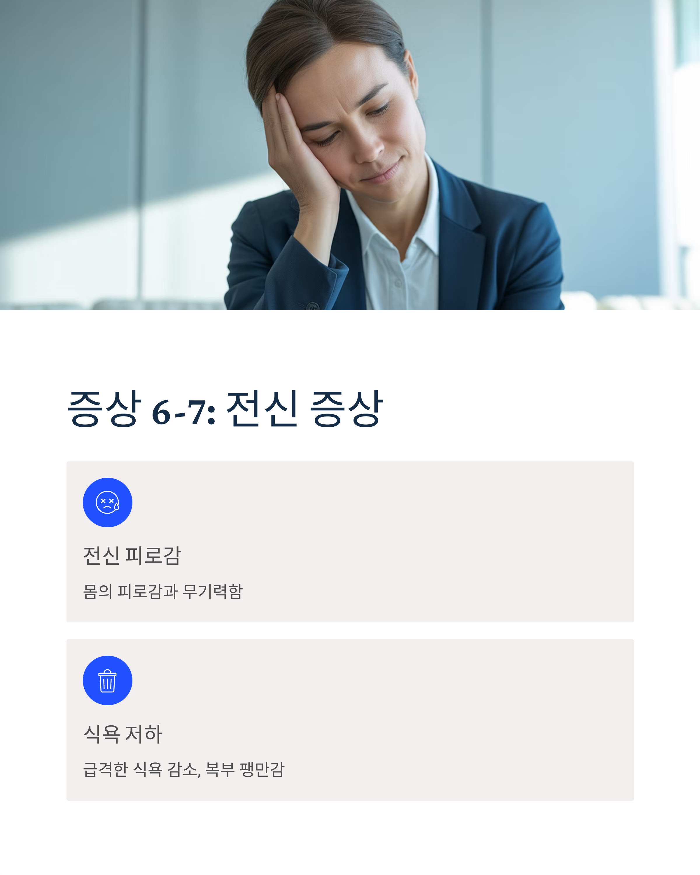 전반적인 몸의 피로감과 무기력함을 느끼며, 이는 장염에 의한 전반적인 몸 상태의 악화를 반영합니다.