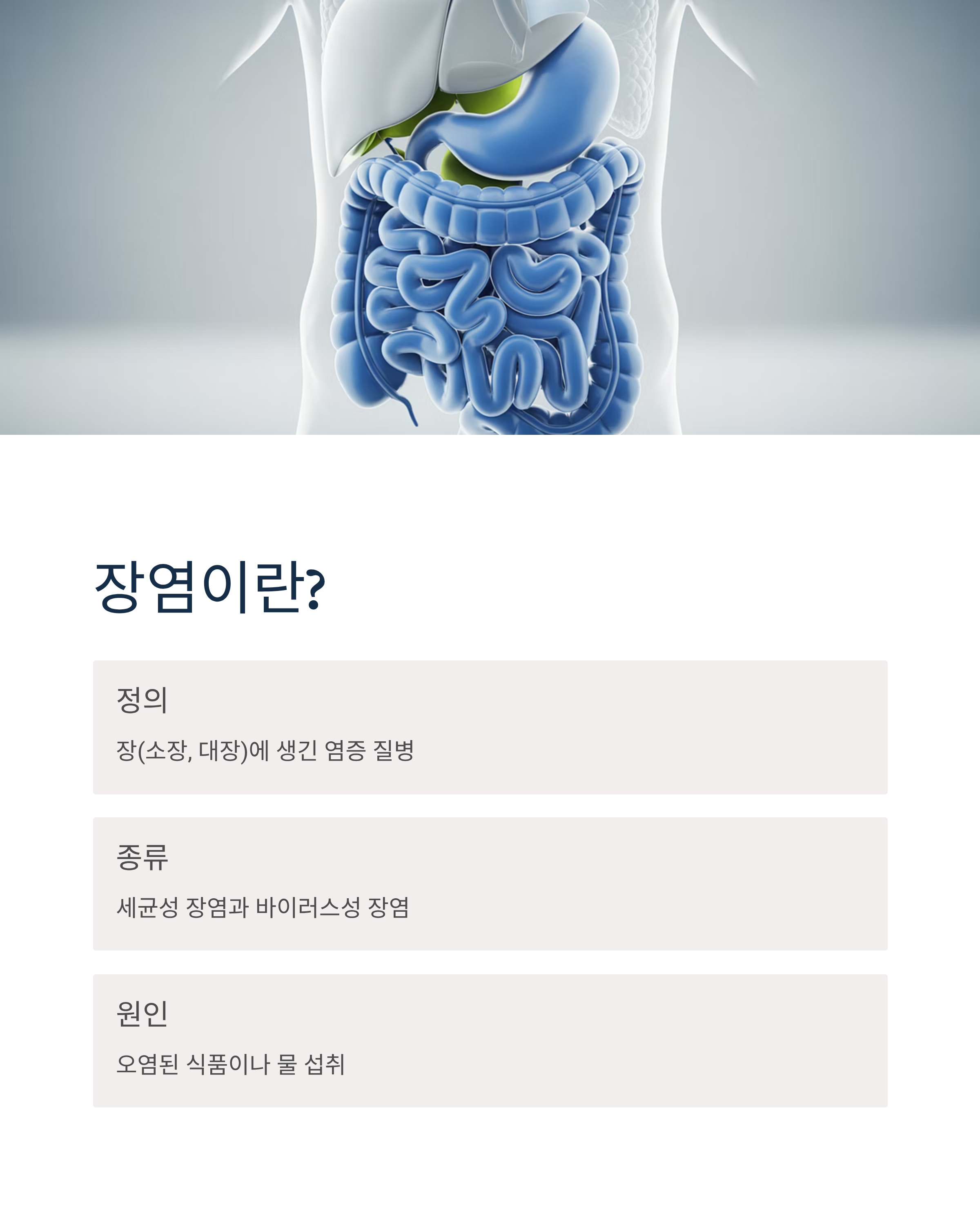 장염은 장(소장, 대장)에 염증이 생기는 질병을 의미합니다. 크게 세균성 장염과 바이러스성 장염으로 분류되며, 대부분 음식 섭취와 관련이 있어 식중독과 구분이 어렵습니다. 다양한 종류의 세균, 바이러스, 원충에 오염된 식품이나 물을 섭취했을 때 감염됩니다.