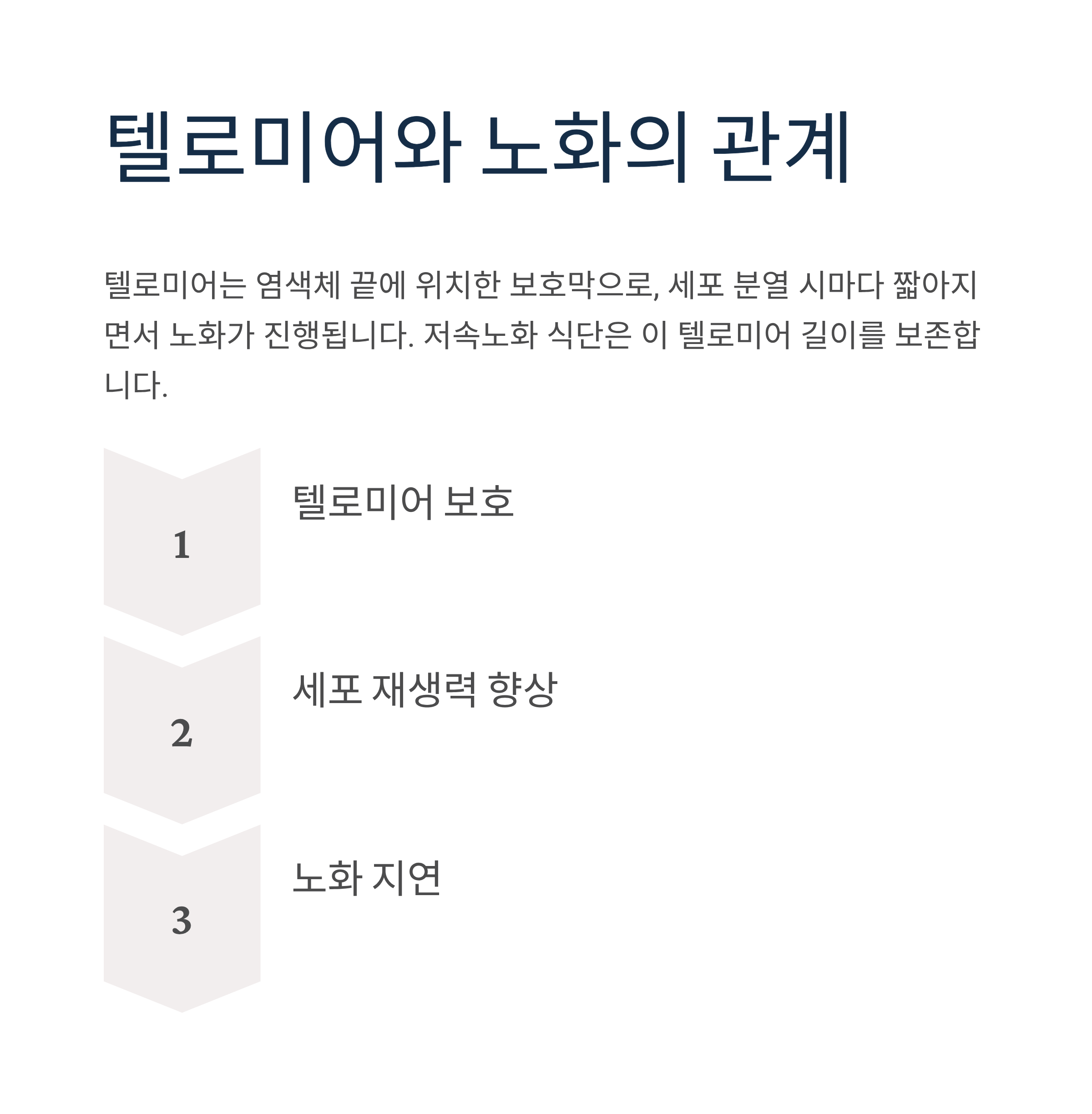 텔로미어는 염색체 끝에 위치한 보호막으로, 세포 분열 시마다 짧아지면서 노화가 진행됩니다. 저속노화 식단은 이 텔로미어 길이를 보존하고 세포 재생력을 높이는 역할을 합니다.