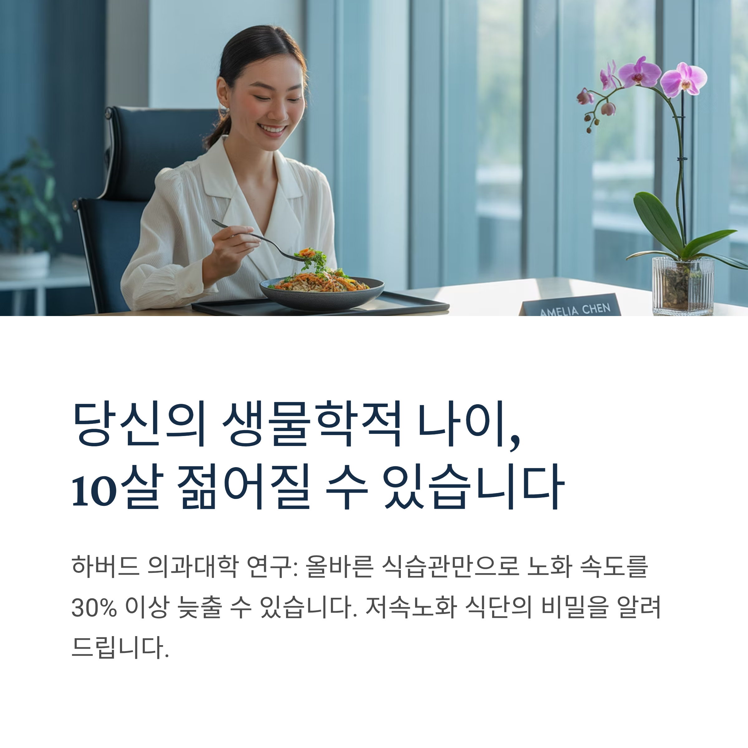 10년 후 거울 속 젊은 당신의 모습이 오늘의 선택에서 시작됩니다. 저속노화 식단으로 건강하고 아름다운 나이듭을 만들어가세요.