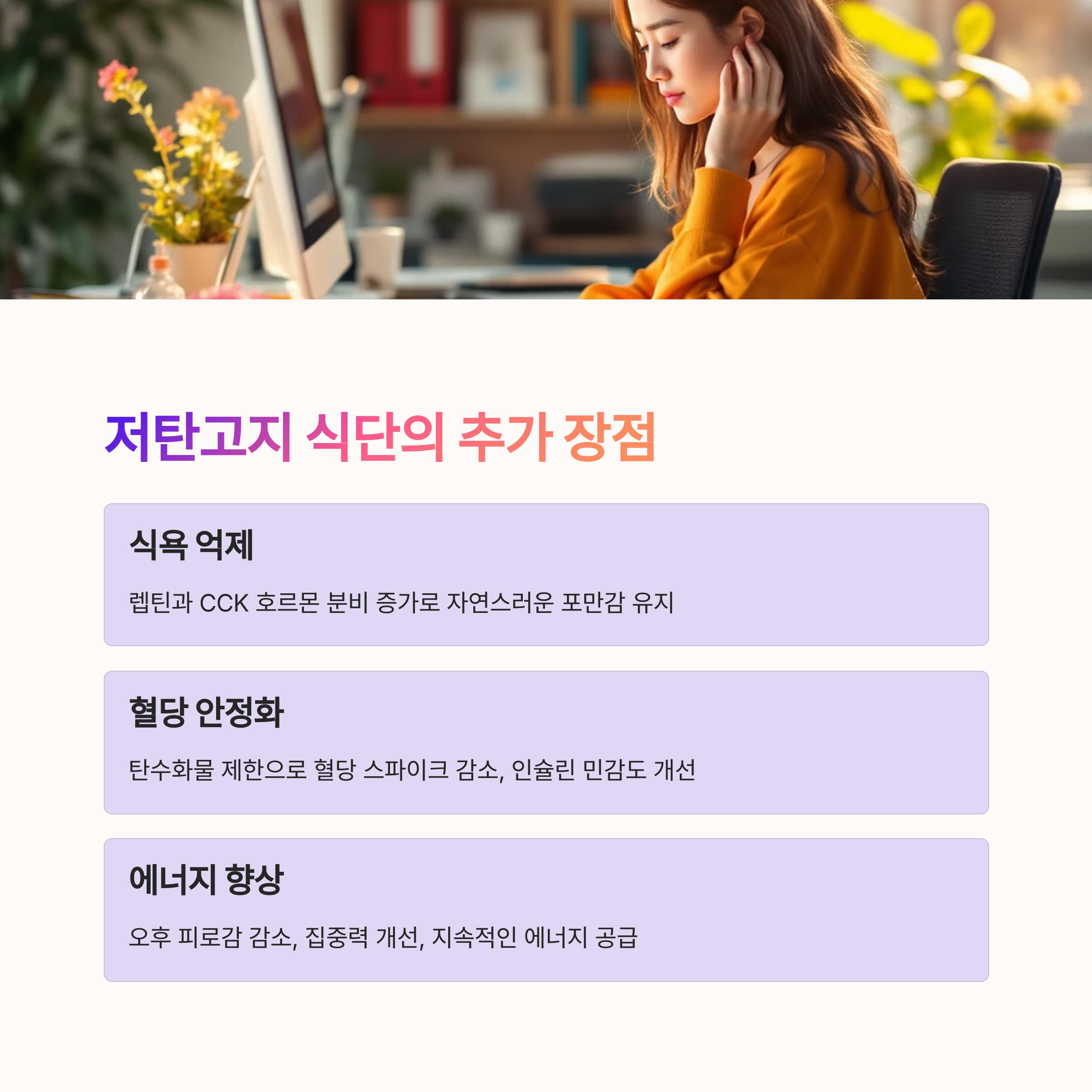지방과 단백질 위주의 식단은 렙틴과 CCK 호르몬 분비를 증가시켜 자연스럽게 식욕을 억제합니다. 더 이상 끊임없는 허기와 싸우지 않아도 됩니다.
