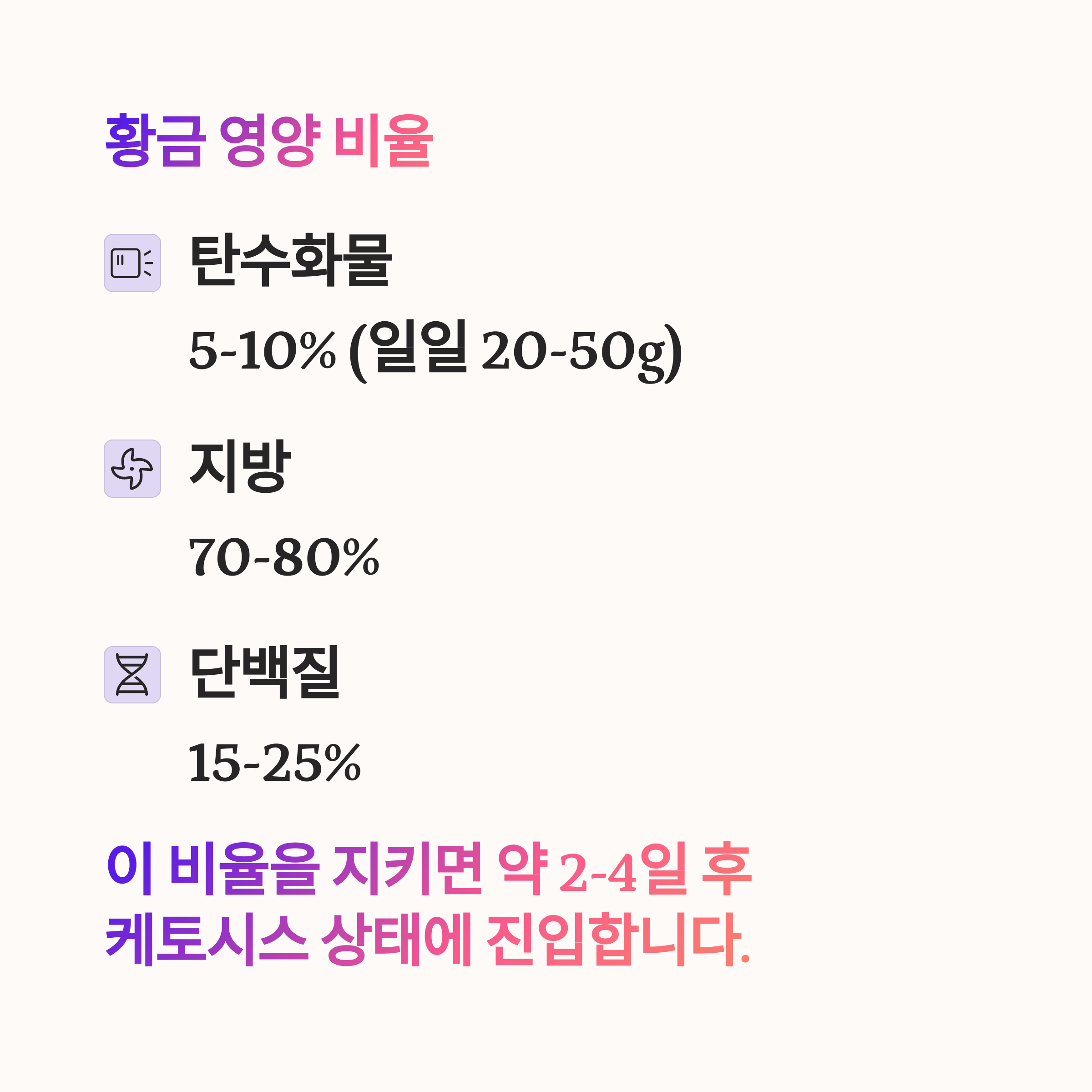 이 비율을 지키면 약 2-4일 후 몸이 케토시스 상태에 진입하게 됩니다.