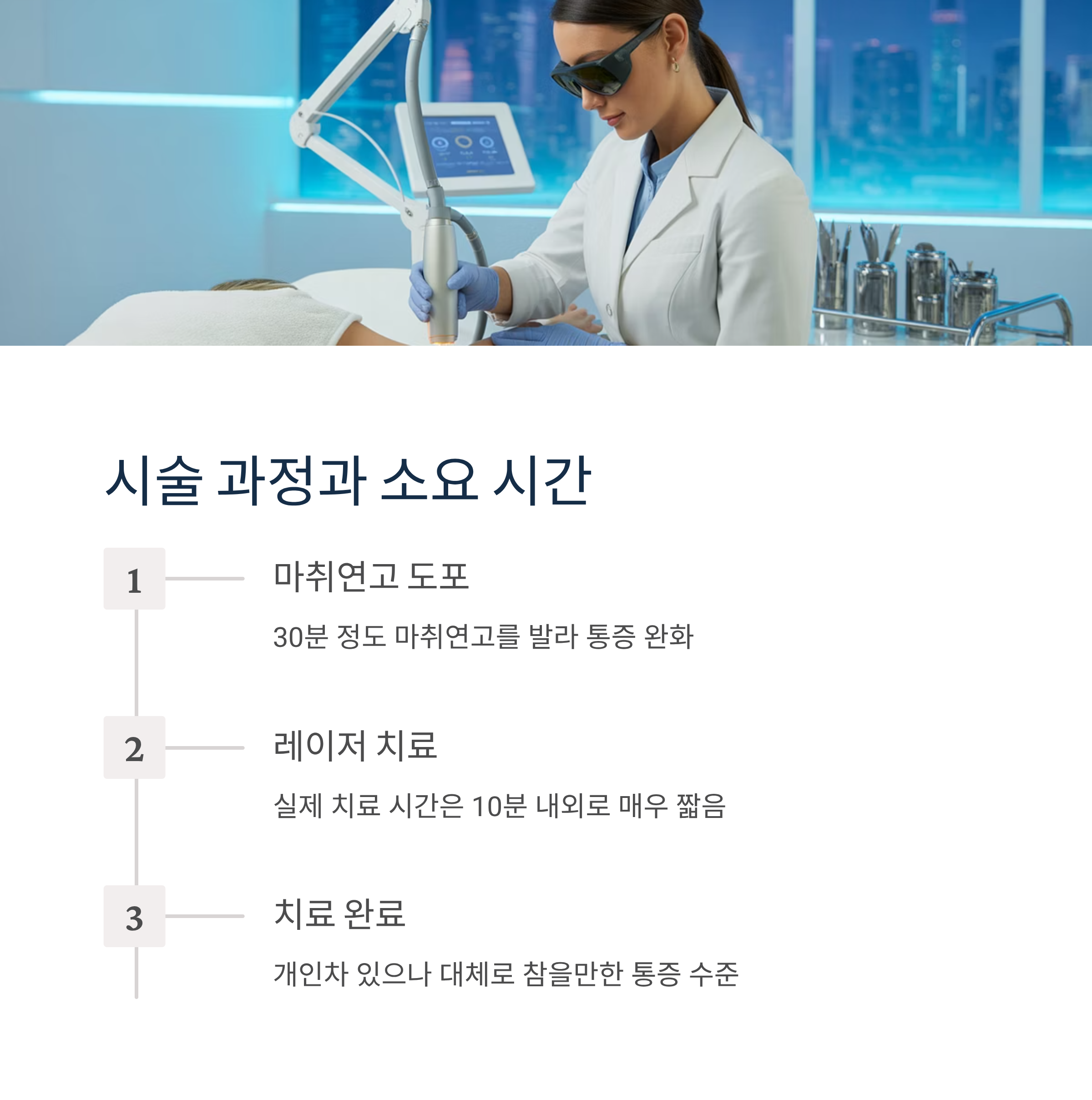 30분 정도 마취연고를 바른 후 시술하며, 레이저 치료 시간은 10분 내외입니다. 통증은 개인차가 있으나 대체로 참을만 합니다.
