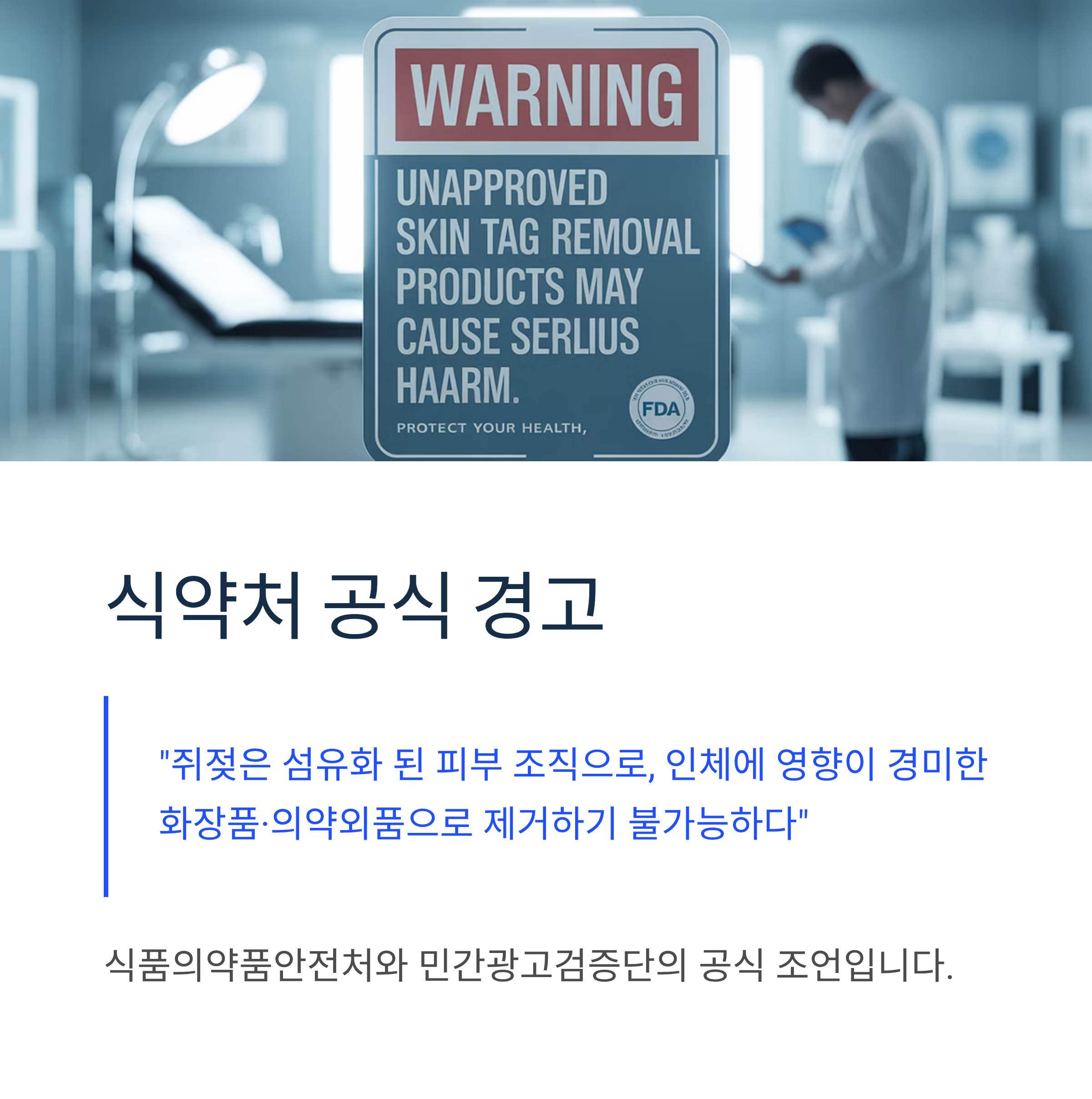 식품의약품안전처와 의료계·소비자단체·학계 등 외부전문가로 구성된 '민간광고검증단'은 "쥐젖은 섬유화 된 피부 조직으로, 인체에 영향이 경미한 화장품·의약외품으로 제거하기 불가능하다"고 조언했습니다.