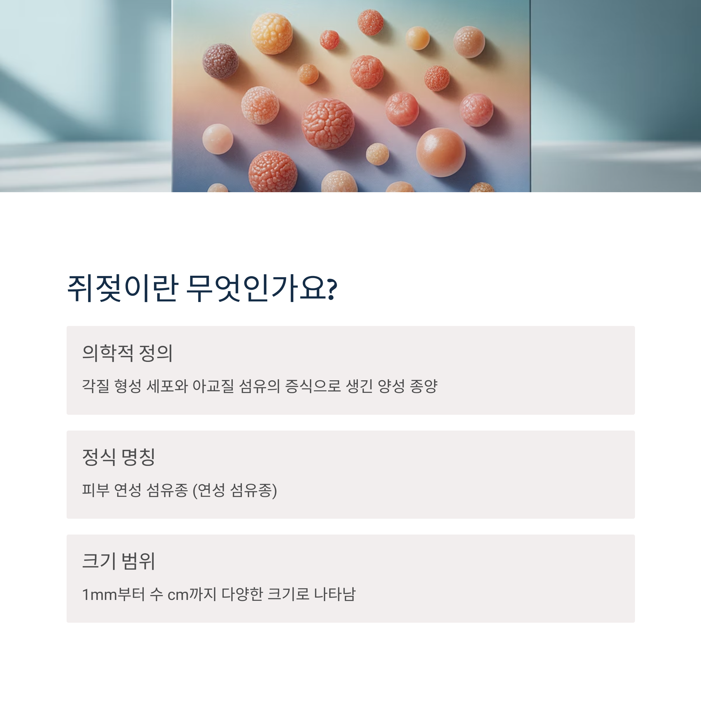 쥐젖은 각질 형성 세포와 아교질 섬유의 증식으로 생긴 섬유상피 양성 종양으로, 연성 섬유종이라 칭합니다. 어미 쥐의 젖처럼 생겼다고 해서 쥐젖이라는 이름이 붙었으며, 의학적으로는 피부 연성 섬유종이 정식 명칭입니다.