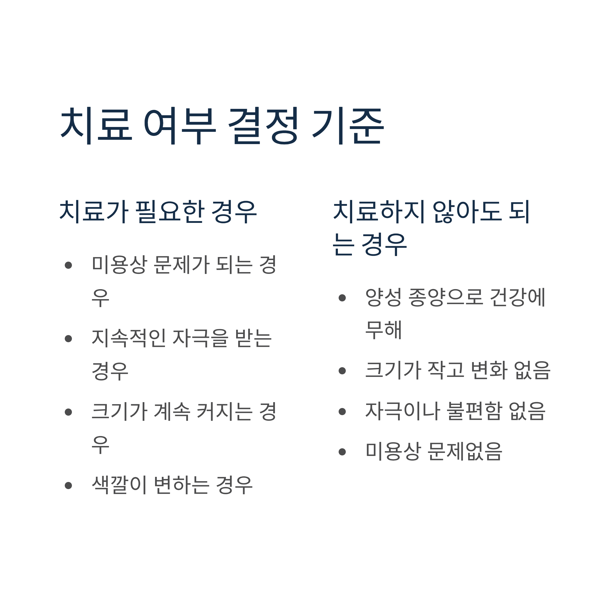 쥐젖은 양성 종양이므로 반드시 치료할 필요는 없지만, 미용상의 이유나 지속적인 자극을 받는 경우에는 제거하는 것이 좋습니다. 가장 중요한 것은 정확한 진단입니다. 쥐젖과 유사한 편평사마귀나 비립종과 구별하여 적절한 치료를 받아야 합니다.