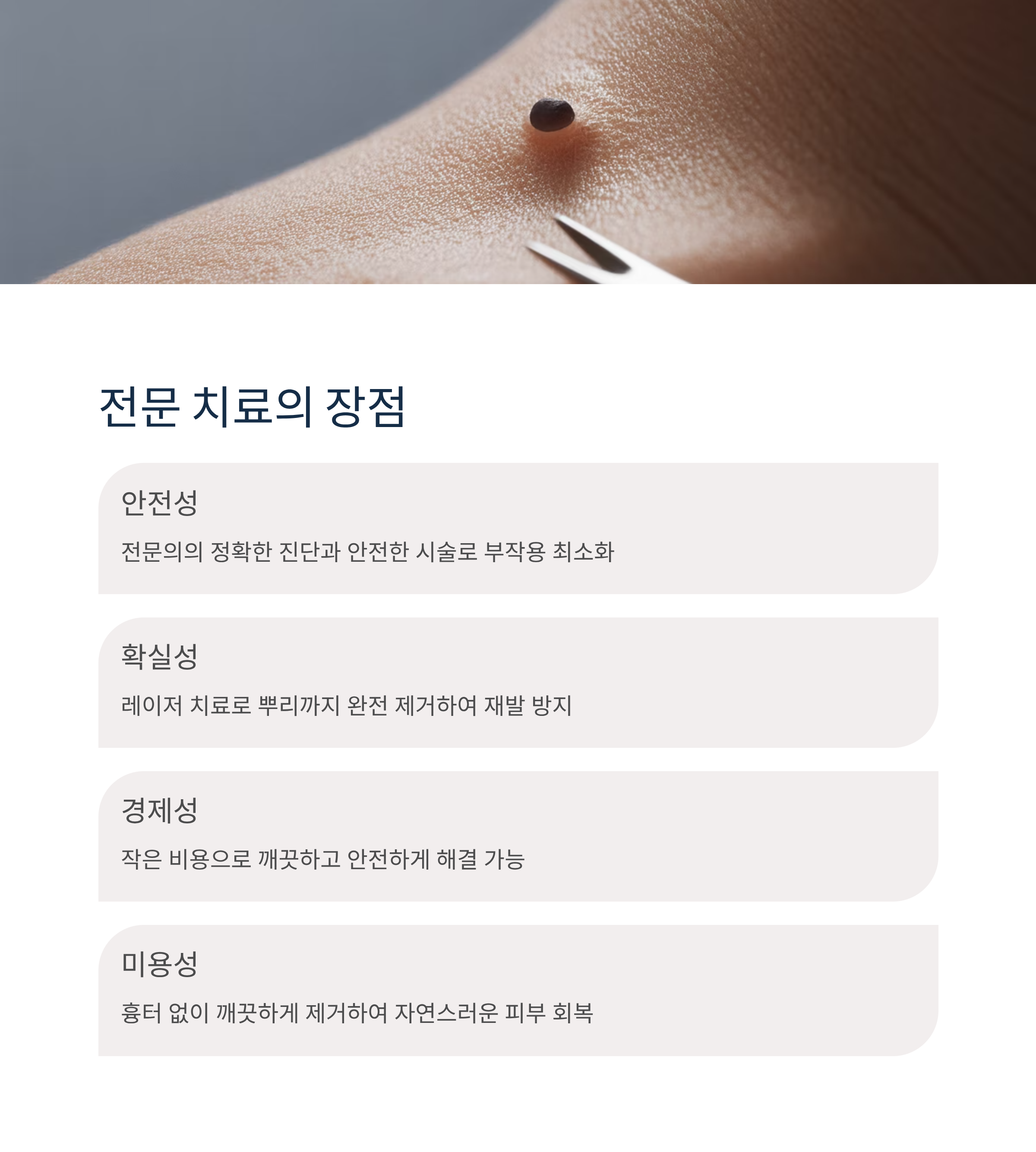 절대 집에서 직접 제거하려 하지 마시고, 안전하고 확실한 피부과 레이저 치료를 받으시길 권합니다. 작은 비용으로 깨끗하고 안전하게 해결할 수 있는 문제를 무리하게 혼자 해결하려다 더 큰 문제가 생길 수 있으니까요.