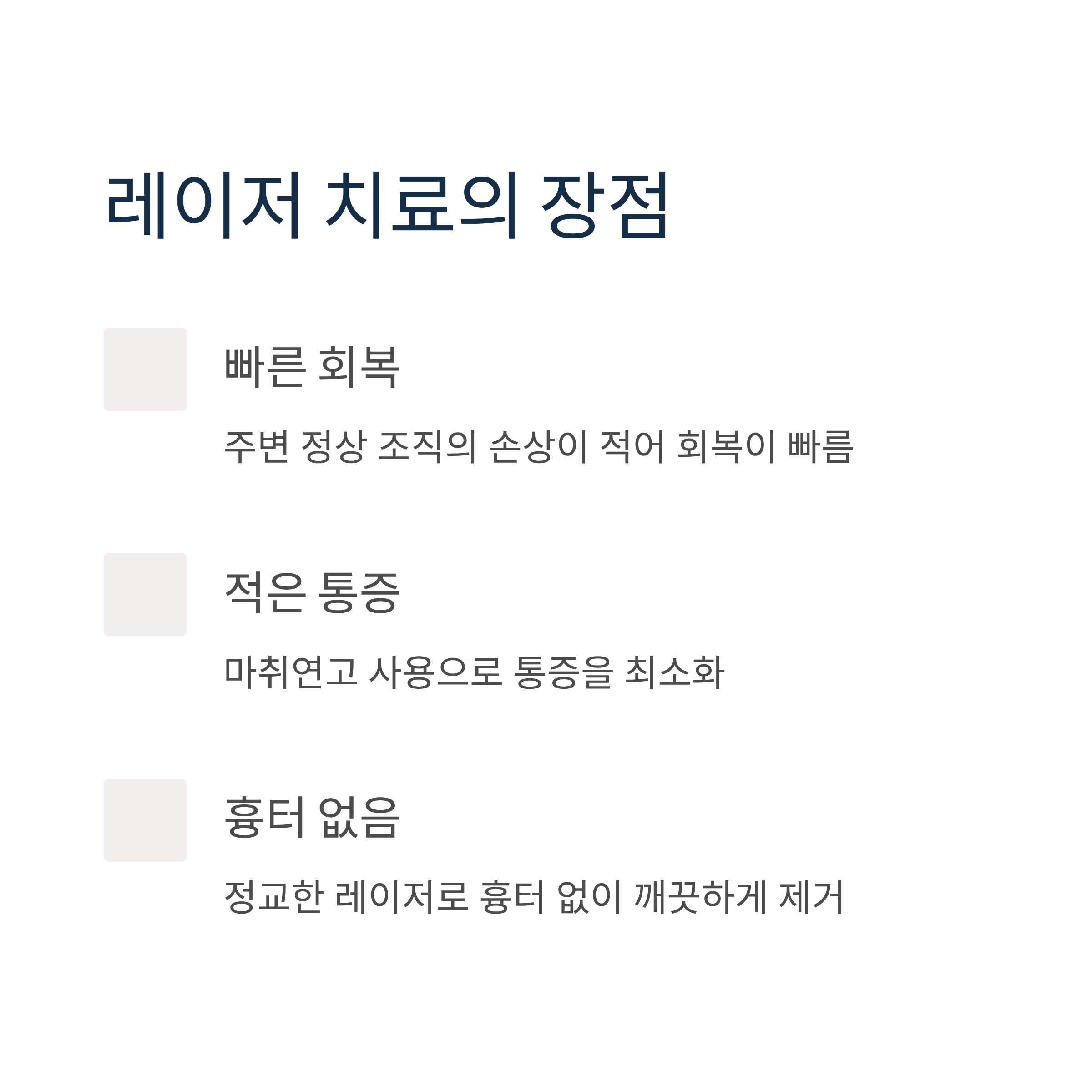 정상 피부 조직은 손상시키지 않고 병변에 깊숙이 침투하여 쥐젖을 안정적으로 제거합니다. 정교하고 세밀한 치료가 가능하며 주변 정상 조직의 손상이 적어 회복이 빠르고 통증이 적습니다.