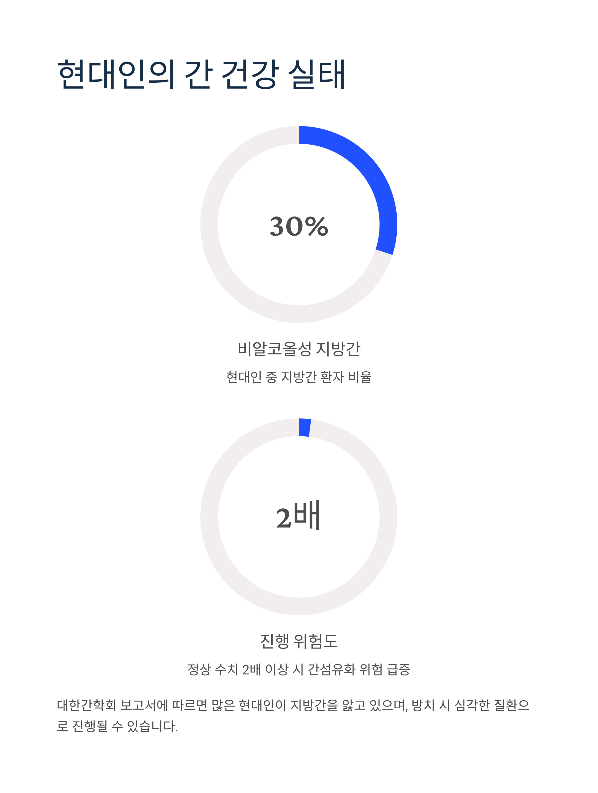 지방간은 간세포에 지방이 5% 이상 축적된 상태를 말합니다. 문제는 초기에는 특별한 증상이 없어 방치하기 쉽다는 것입니다. 하지만 대한간학회 보고서에 따르면 현대인의 약 30%가 비알코올성 지방간을 앓고 있으며, 방치할 경우 간염, 간섬유화, 간경변, 심지어 간암으로 진행될 수 있습니다.