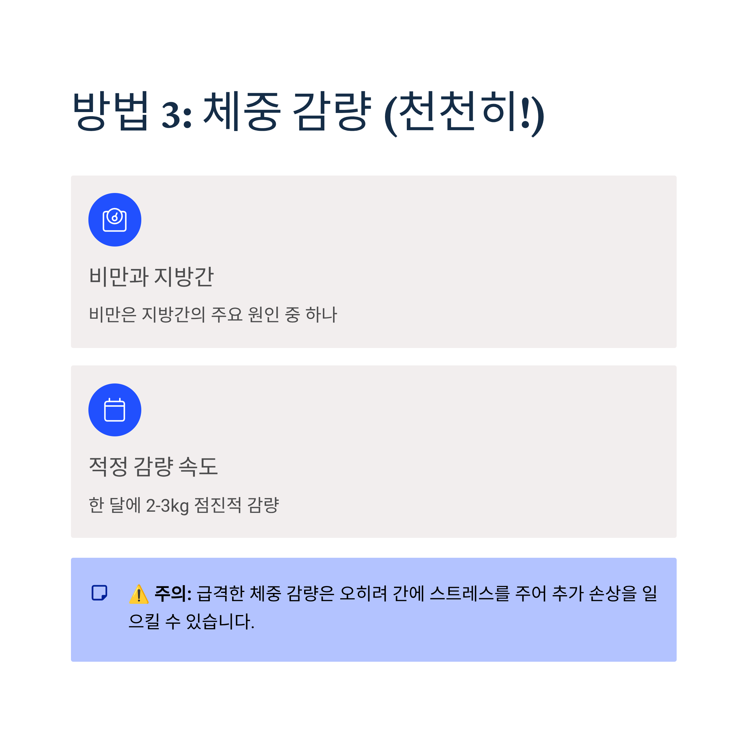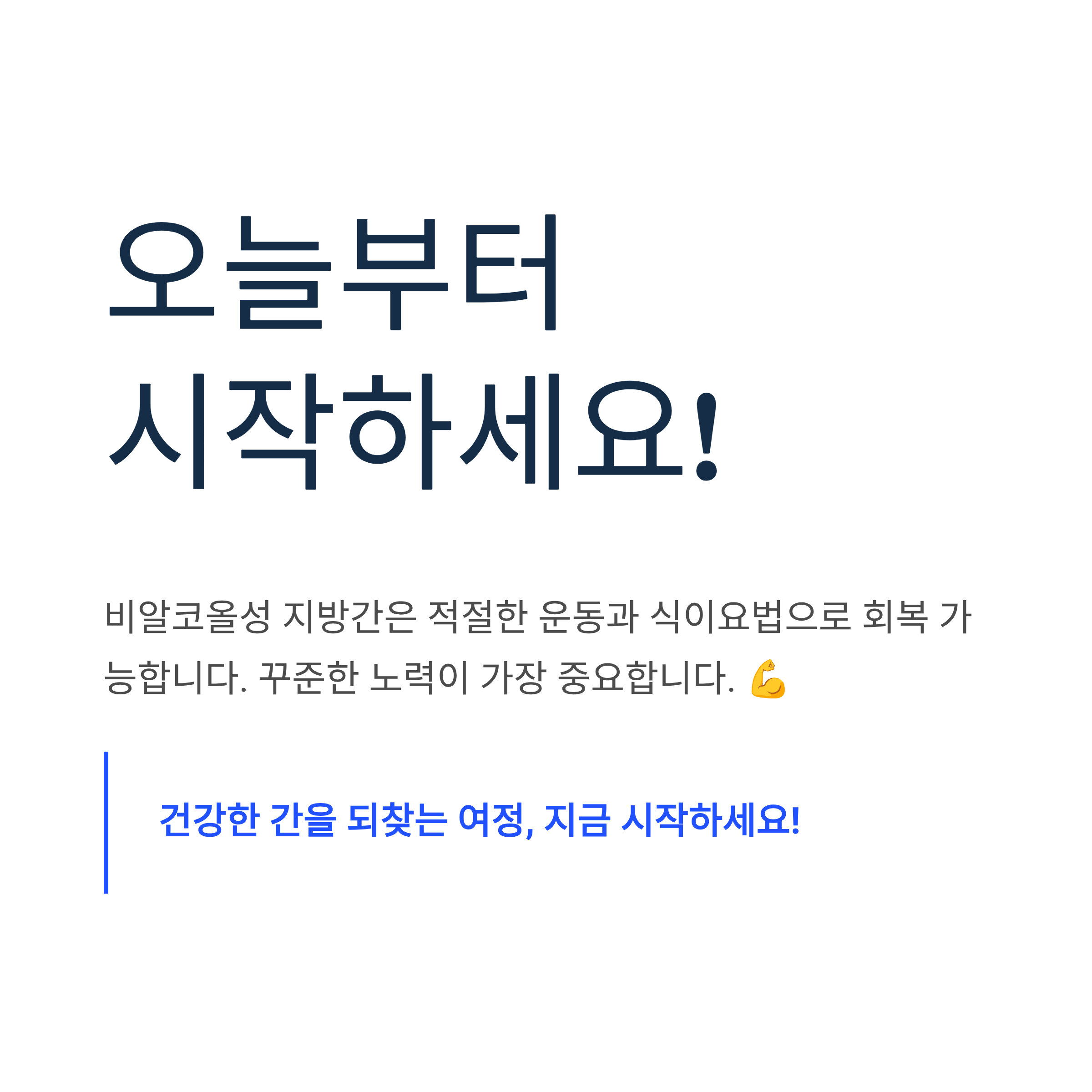주의사항: 급격한 체중 감량은 오히려 간에 스트레스를 주어 추가 손상을 일으킬 수 있습니다. 한 달에 2-3kg 정도의 점진적인 감량을 목표로 하세요.