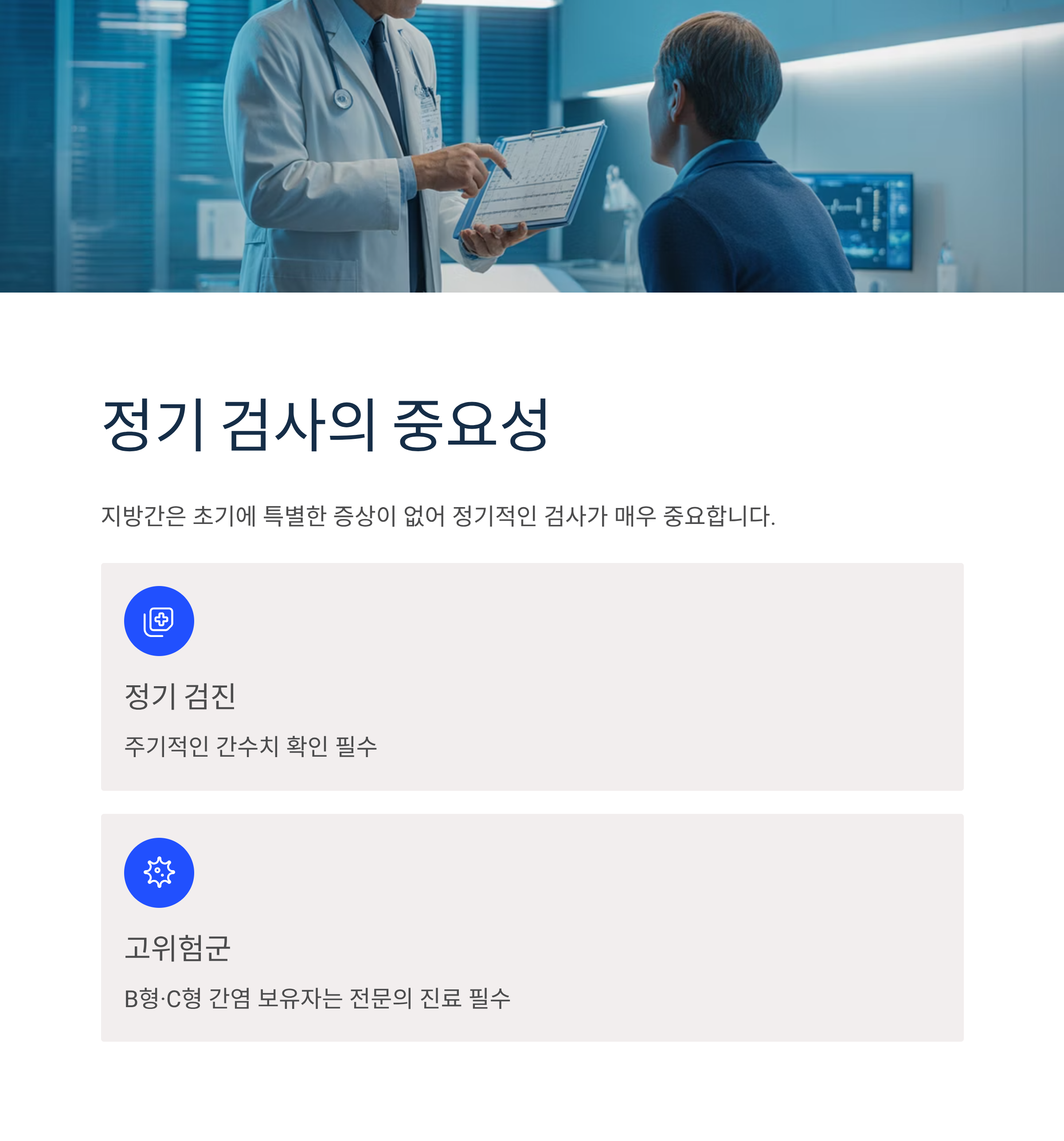 지방간은 초기에 특별한 증상이 없어 정기적인 검사가 매우 중요합니다. B형 간염, C형 간염 바이러스 보유자나 과도한 음주력이 있는 사람들은 반드시 주기적으로 전문의의 진료를 받아야 합니다.