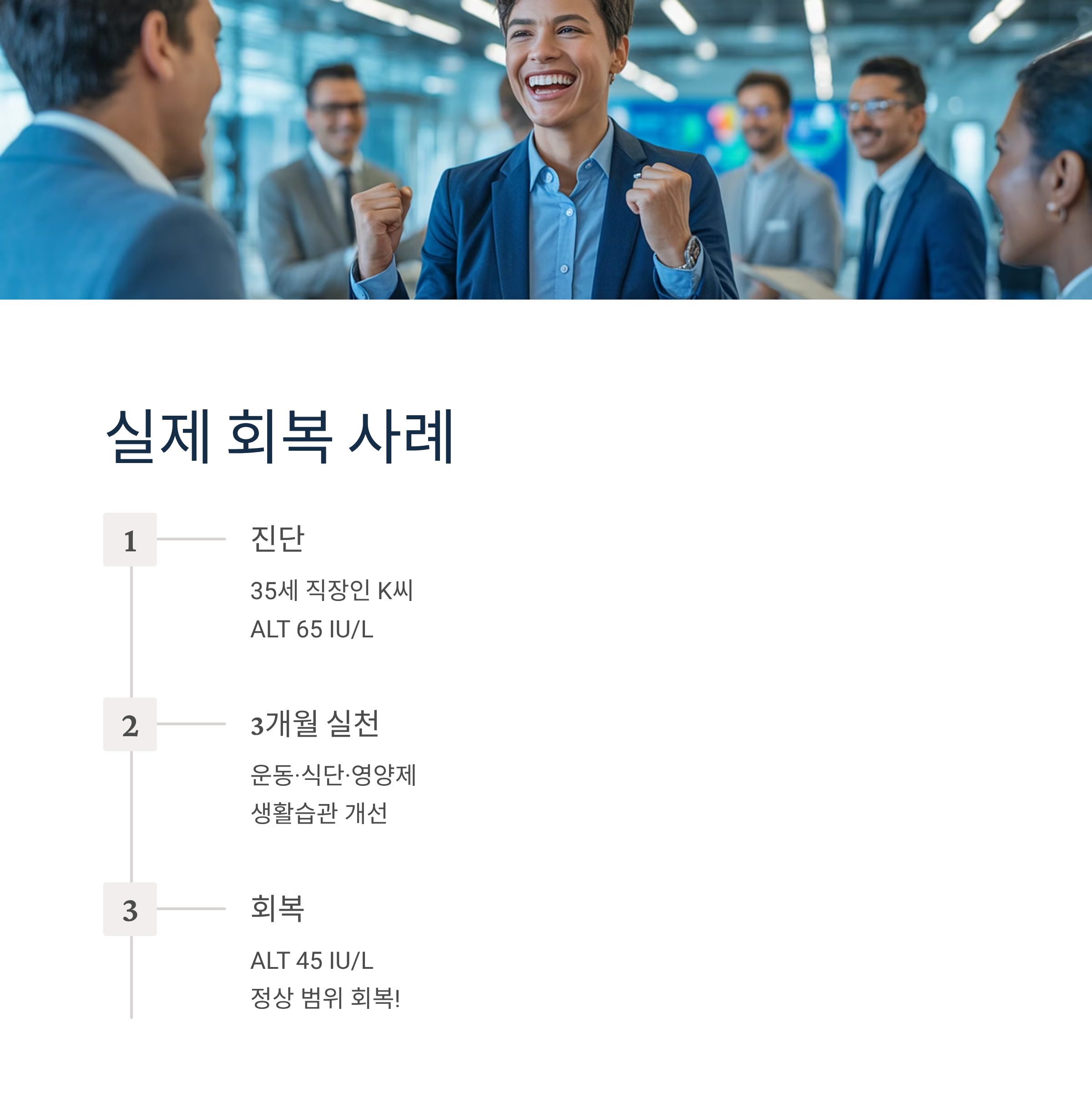 결과: 3개월 후 재검사에서 ALT 45 IU/L로 정상 범위 회복!