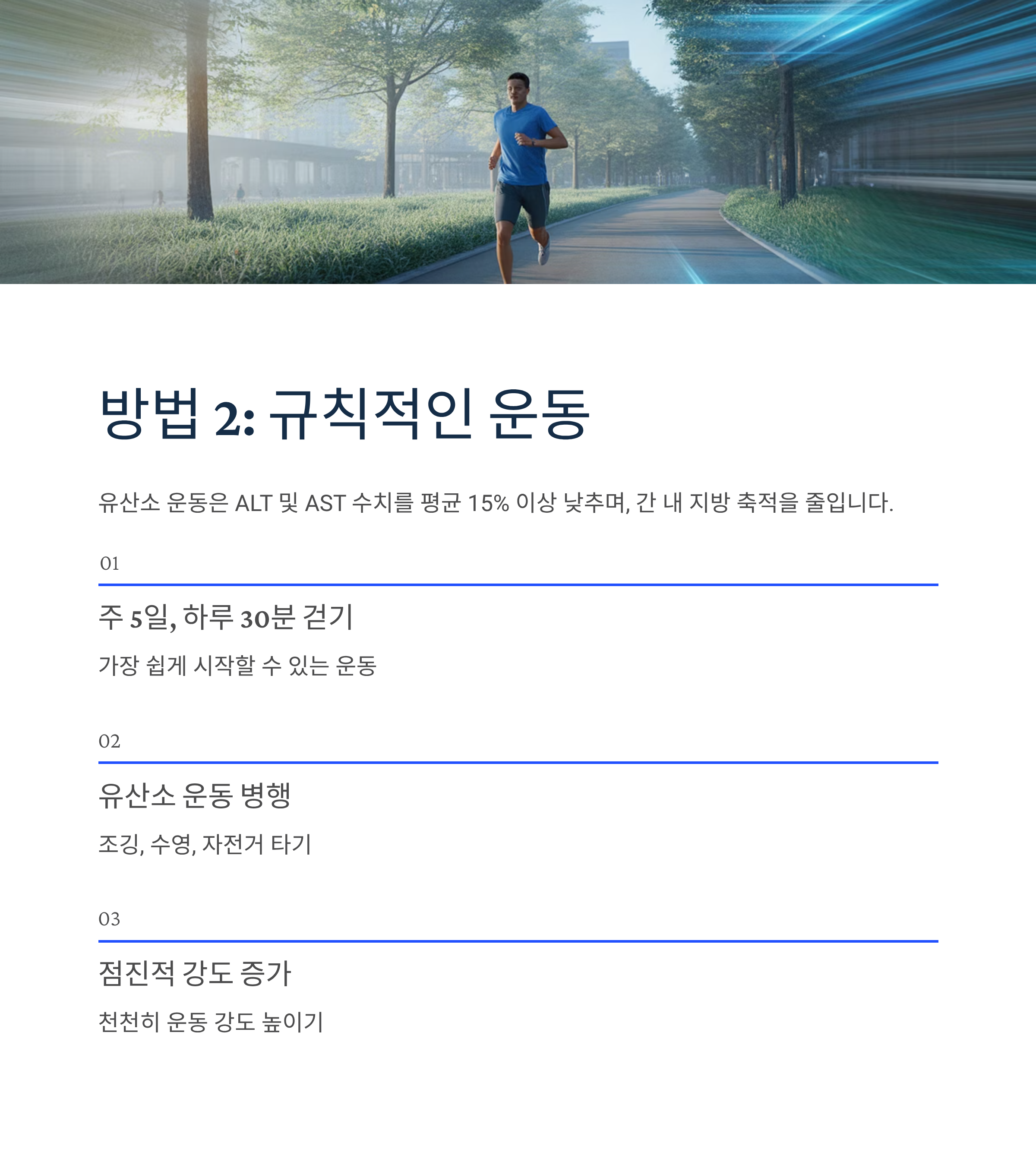 연구에 따르면 규칙적인 유산소 운동은 ALT 및 AST 수치를 평균 15% 이상 낮추는 효과가 있습니다. 운동은 간 내 지방 축적을 줄이고 염증을 완화시키는 데 기여합니다.
