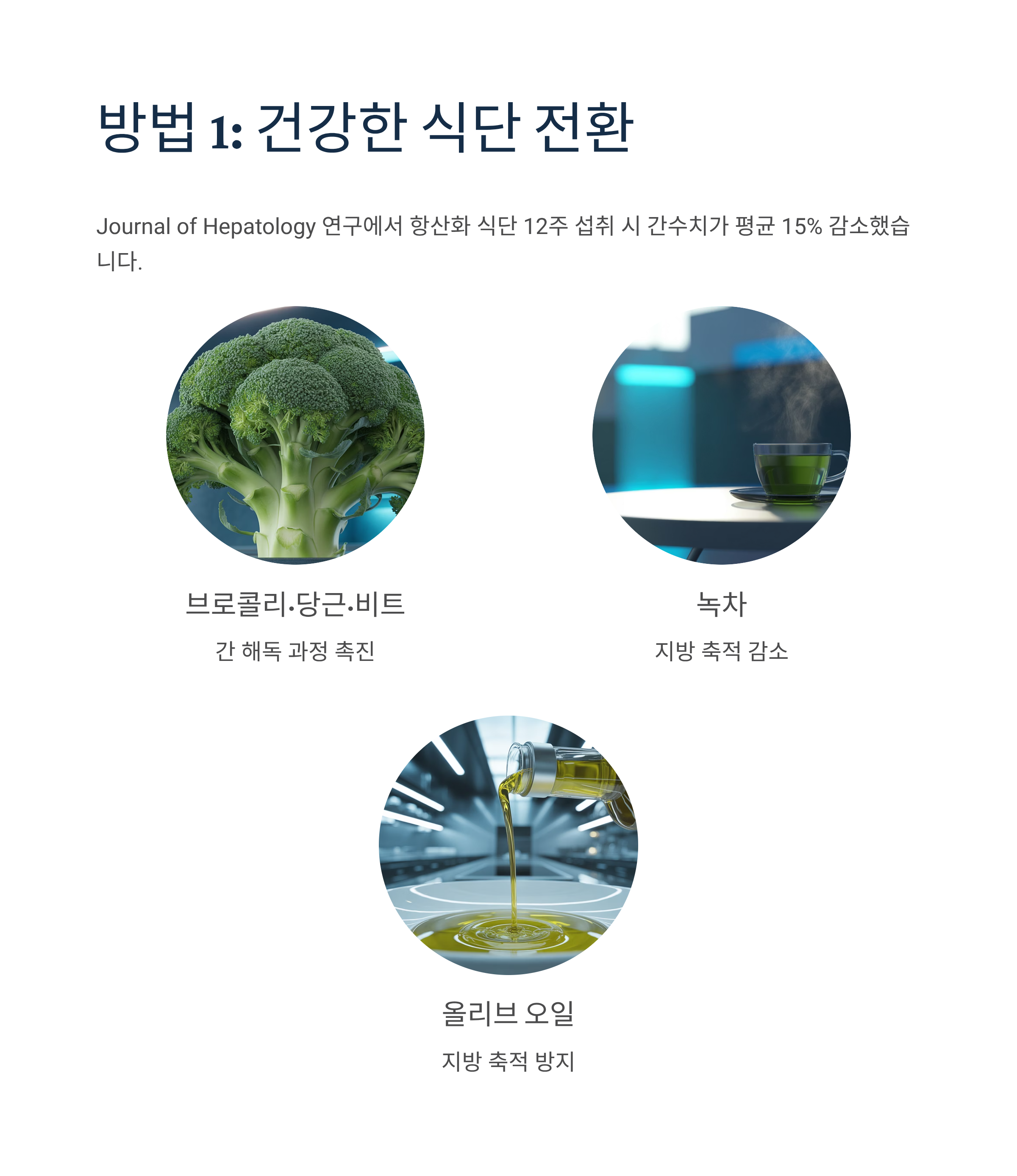 Journal of Hepatology 연구에서 항산화 성분이 풍부한 식단을 12주 이상 섭취한 실험군의 간수치(AST, ALT)가 평균 15% 감소했다는 결과가 나왔습니다.